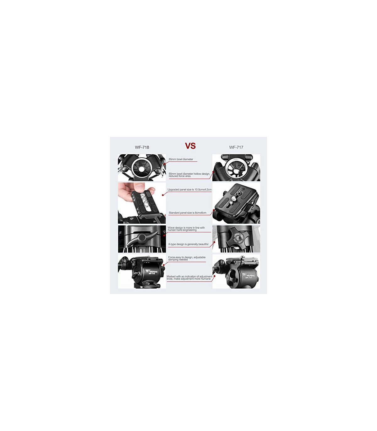 سه پایه فیلم برداری ویفنگ مدل WT-718 نیز از محصولات همین کمپانی میباشد. این محصول بهطور اختصاصی برای استفاده حرفهای در فیلمبرداری طراحی و ساخته شده است و همراه آن یک هد مخصوص از نوع Fluid Head نیز ارائه میشود. این هد قابلیت پنینگ ۳۶۰ درجه و تیلت از منفی ۹۰ تا مثبت ۹۰ درجه را در اختیار کاربر قرار میدهد. همچنین پایههای این محصول برای دستیابی به بیشترین استحکام و پایداری از نوع تری انگل میباشند. وزن کلی این محصول برابر ۳.۵ کیلوگرم بوده و دارای تحمل وزن حداکثر ۸ کیلوگرمی میباشد. ارتفاع این محصول در بیشترین حالت ۱۸۸ سانتیمتر خواهد بود.