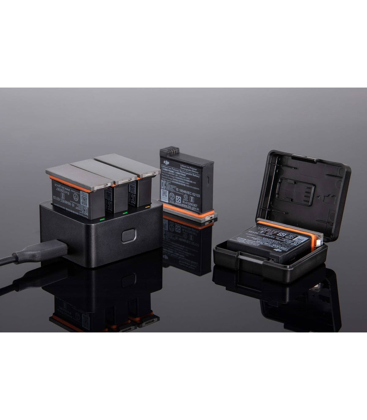کیت باتری و شارژر دوربین DJI Osmo Action مخصوص دوربین ورزشی Osmo action است. این کیت شامل دو عدد باتری لیتیوم پلیمری با ظرفیت 1300 میلی آمپر ساعت، یک هاب شارژر با سه عدد درگاه و دو عدد قاب باتری است.