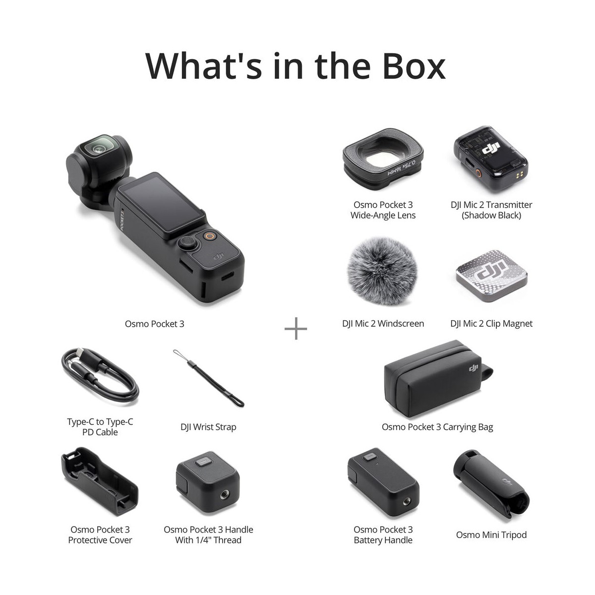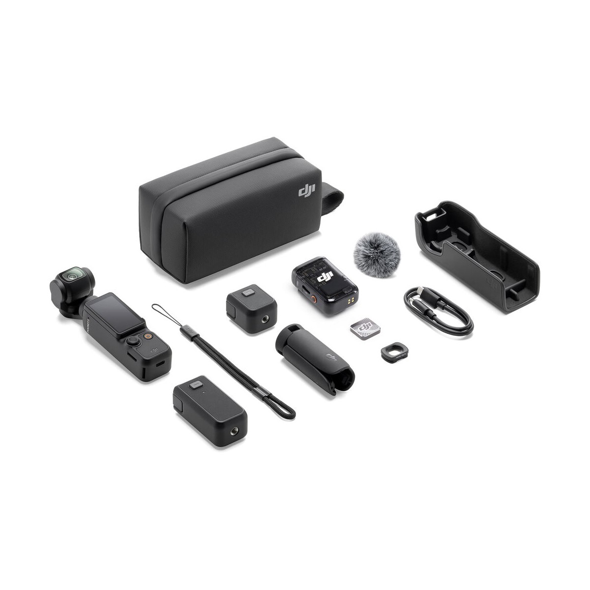 - دوربین Osmo Pocket 3، کابل USB-C به USB-C ، پوشش محافظ، بند مچی، دستگیره Osmo Pocket 3 با رزوه ۴/۱ اینچی، لنز واید، فرستنده، بادگیر، گیره آهنربایی، دستگیره باتری، مینی سهپایه و کیف حمل