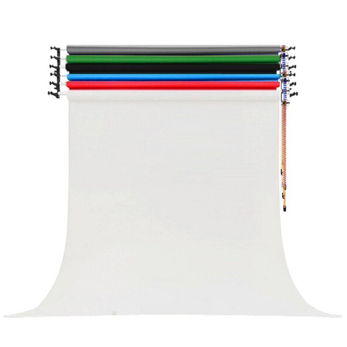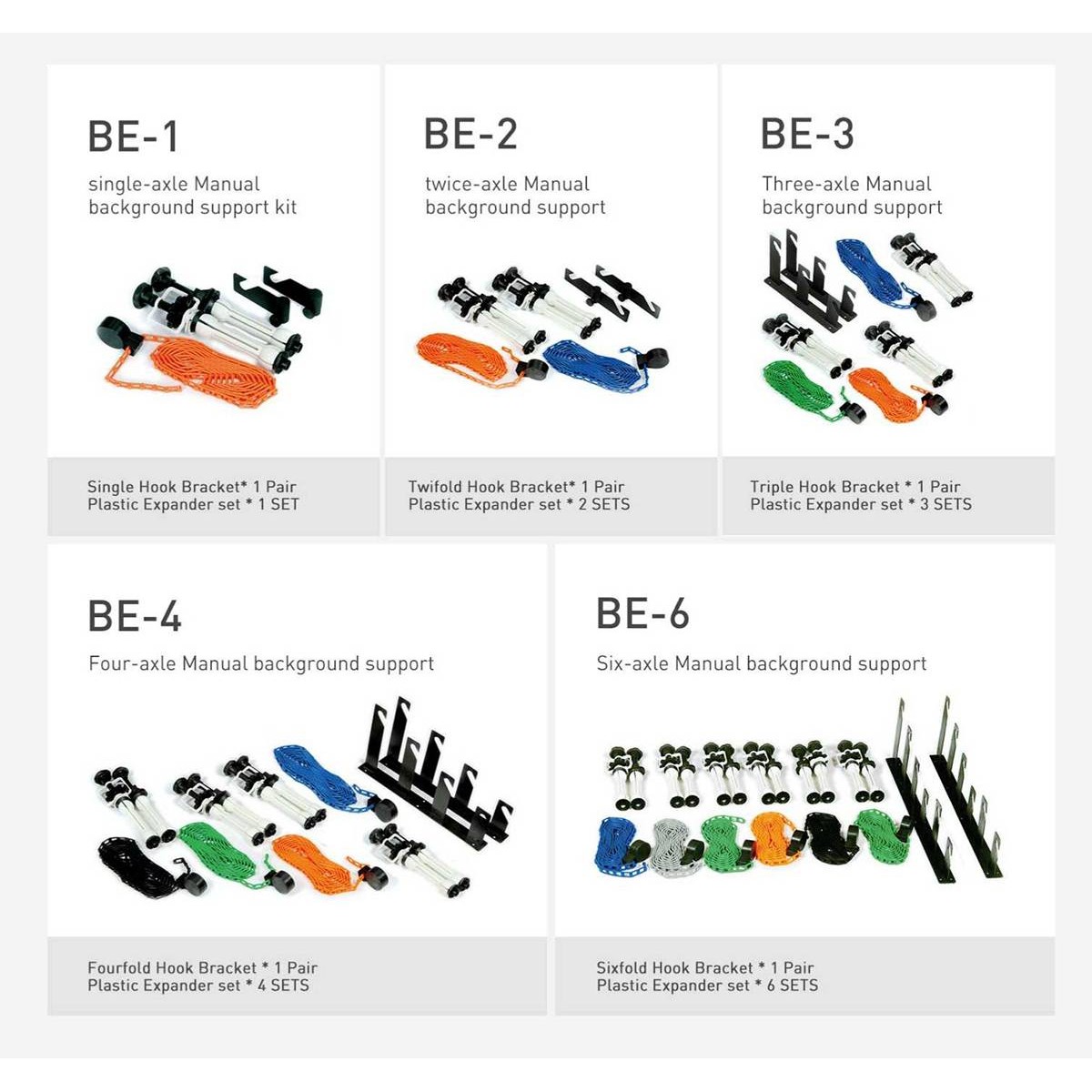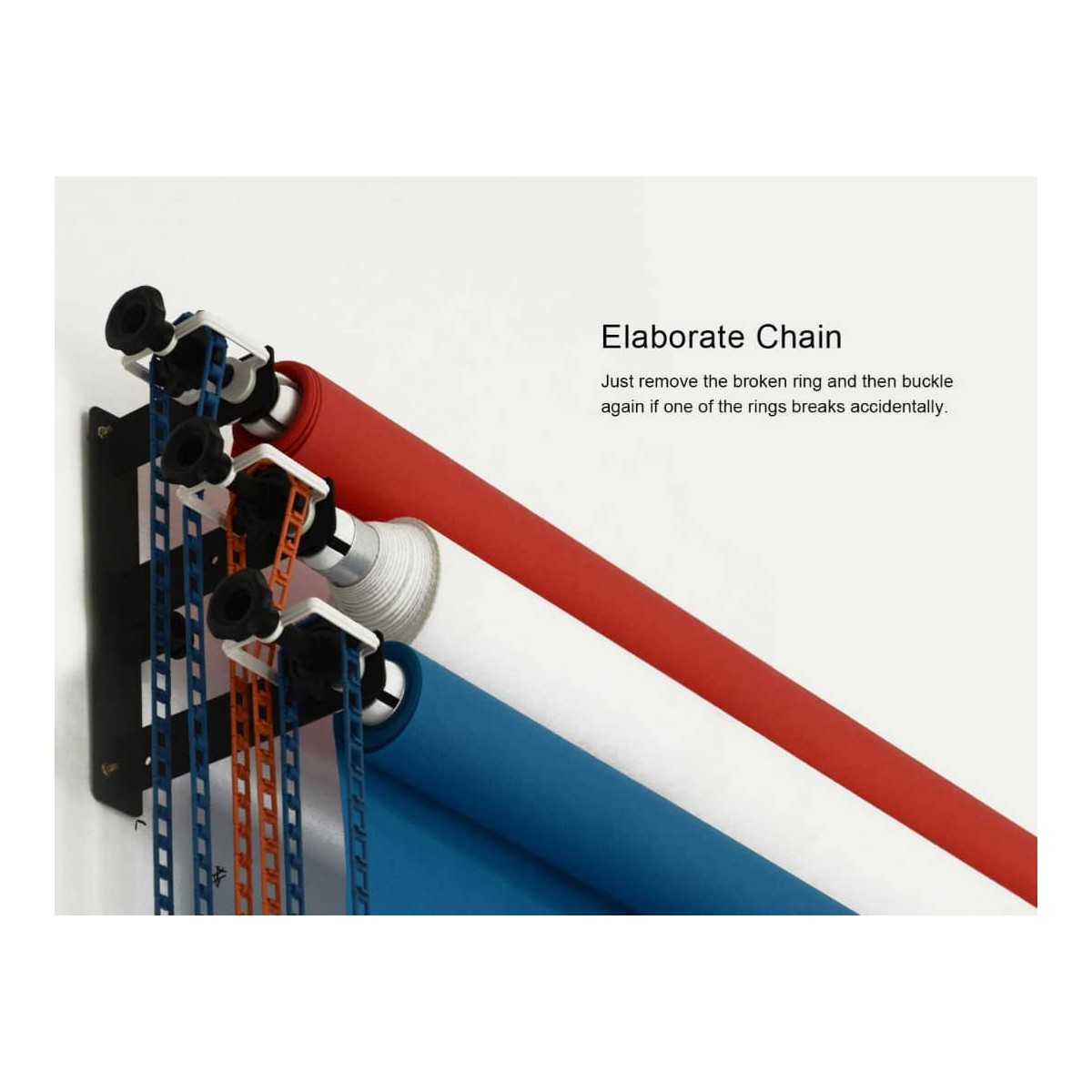 هولدر نانلایت BE-6 به گونهای طراحی شده است که بتواند شش رول بکگراند را به طور همزمان پشتیبانی کند. این موضوع برای استودیوهایی که نیاز به تغییر سریع میان رنگها یا جنسهای مختلف فون دارند، یک مزیت بزرگ محسوب میشود. طراحی محصول شامل دو عدد قلاب فلزی ششگانه است که روی دیوار یا سقف نصب میشوند. سپس هر رول فون روی یک محور نصب شده و به کمک سیستم قرقره و زنجیر حرکت میکند. زنجیرهای ارائهشده در این پکیج به صورت رنگی طراحی شدهاند. این ویژگی ساده اما بسیار هوشمندانه باعث میشود کاربر در هنگام کار به راحتی تشخیص دهد کدام زنجیر مربوط به کدام فون است. این موضوع در شرایطی که سرعت عمل اهمیت دارد، به شدت کاربردی خواهد بود.