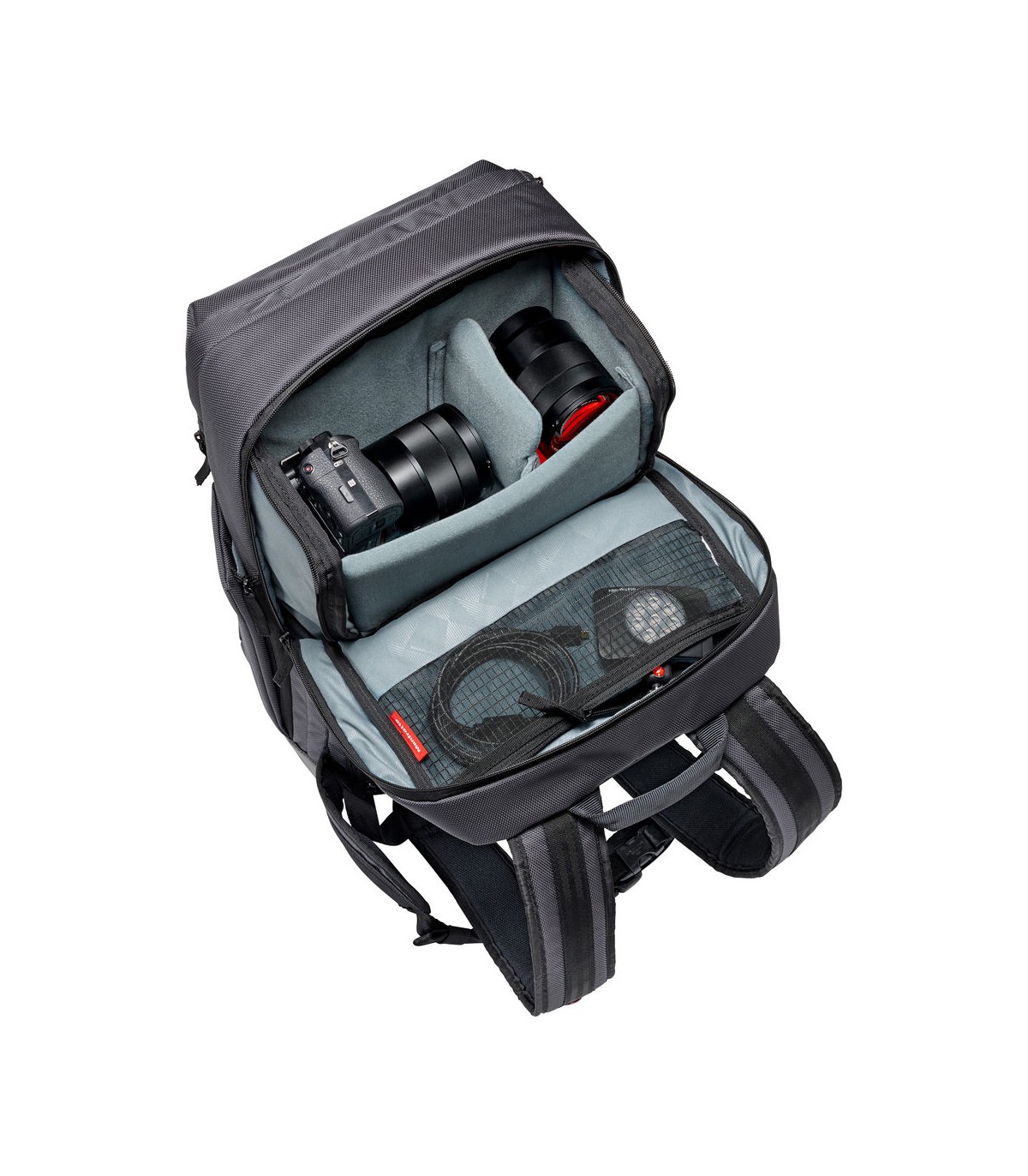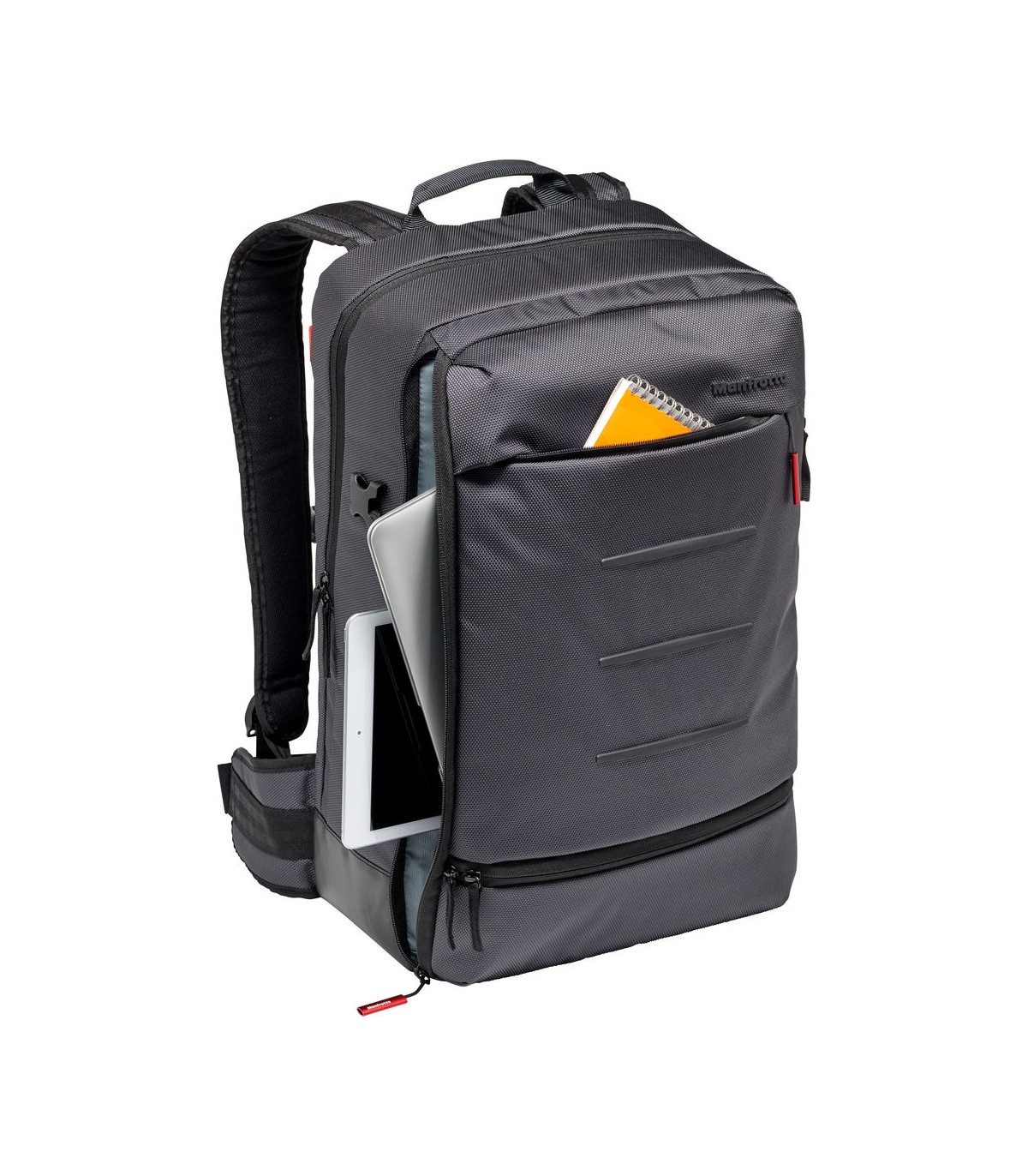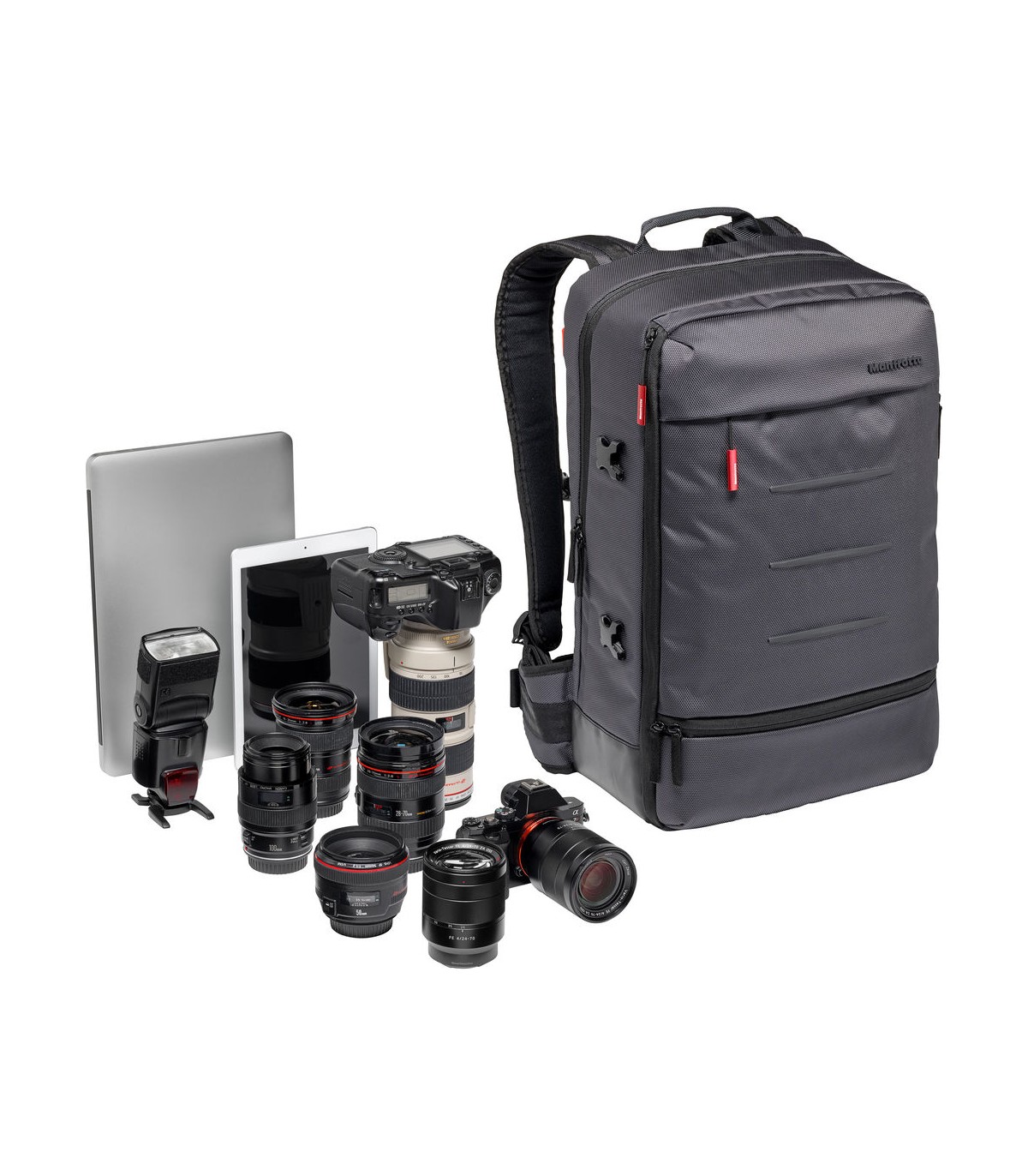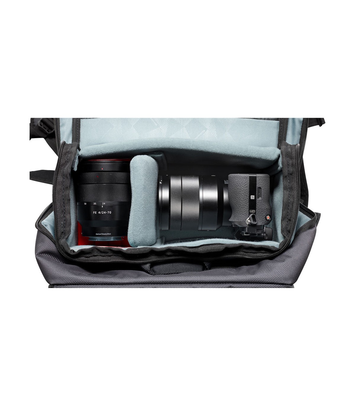 کوله پشتی مانفروتو Manhattan Mover-50 یک راه حل عالی برای حمل و نقل یا نگهداری از تجهیزات عکاسی است. این کوله پشتی با دسترسی آسان از بالا و پشت، به پدهای جداکننده قابل تنظیمی مجهز شده تا به راحتی یک دوربین بدون آیینه با لنز متصل 70-200mm f/1.8، 4 لنز اضافه، فلاش و تجهیزات جانبی را در خود جای دهد. فضای مخصوص لپتاپ به پدهای ضربه گیر مجهز شده و برای لپتاپ تا سایز 15.6 اینچ مناسب است. یک جیب برای حمل آیپد پرو 9.7 اینچ نیز در این کیف تعبیه شده است. جیب های کناری نیز برای حمل بطری آب یا لوازم شخصی مناسب هستند.
