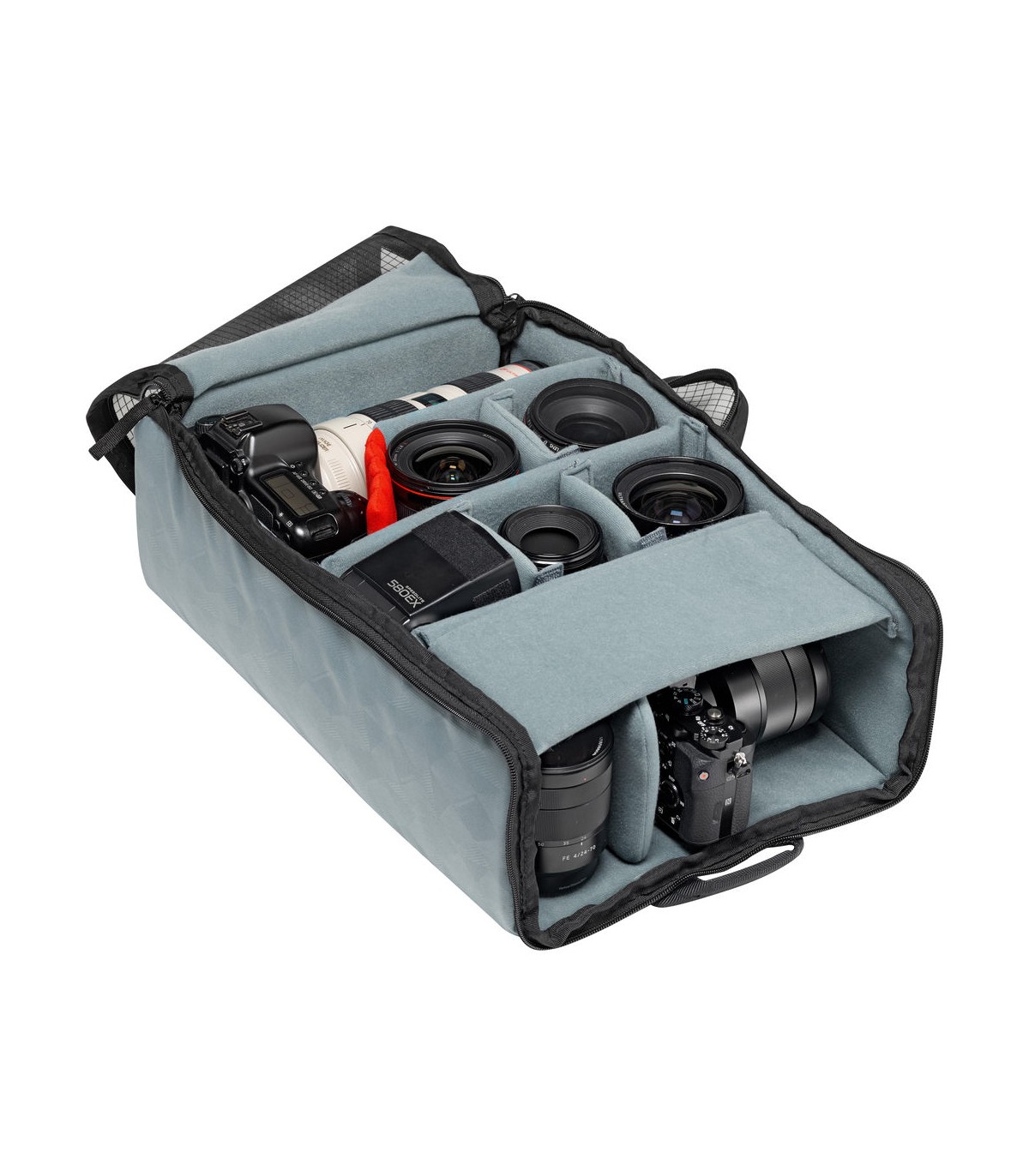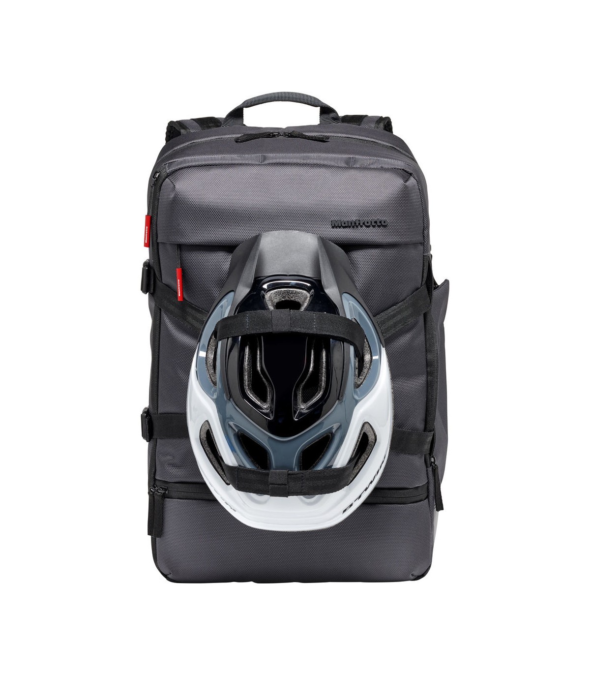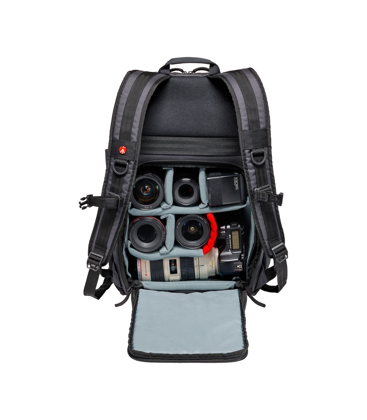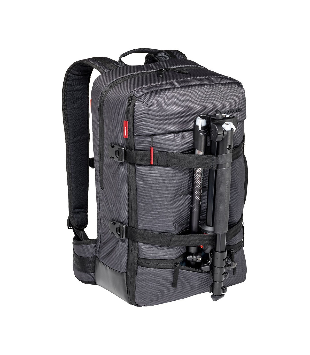 کوله پشتی مانفروتو Manhattan Mover-50 یک راه حل عالی برای حمل و نقل یا نگهداری از تجهیزات عکاسی است. این کوله پشتی با دسترسی آسان از بالا و پشت، به پدهای جداکننده قابل تنظیمی مجهز شده تا به راحتی یک دوربین بدون آیینه با لنز متصل 70-200mm f/1.8، 4 لنز اضافه، فلاش و تجهیزات جانبی را در خود جای دهد. فضای مخصوص لپتاپ به پدهای ضربه گیر مجهز شده و برای لپتاپ تا سایز 15.6 اینچ مناسب است. یک جیب برای حمل آیپد پرو 9.7 اینچ نیز در این کیف تعبیه شده است. جیب های کناری نیز برای حمل بطری آب یا لوازم شخصی مناسب هستند.