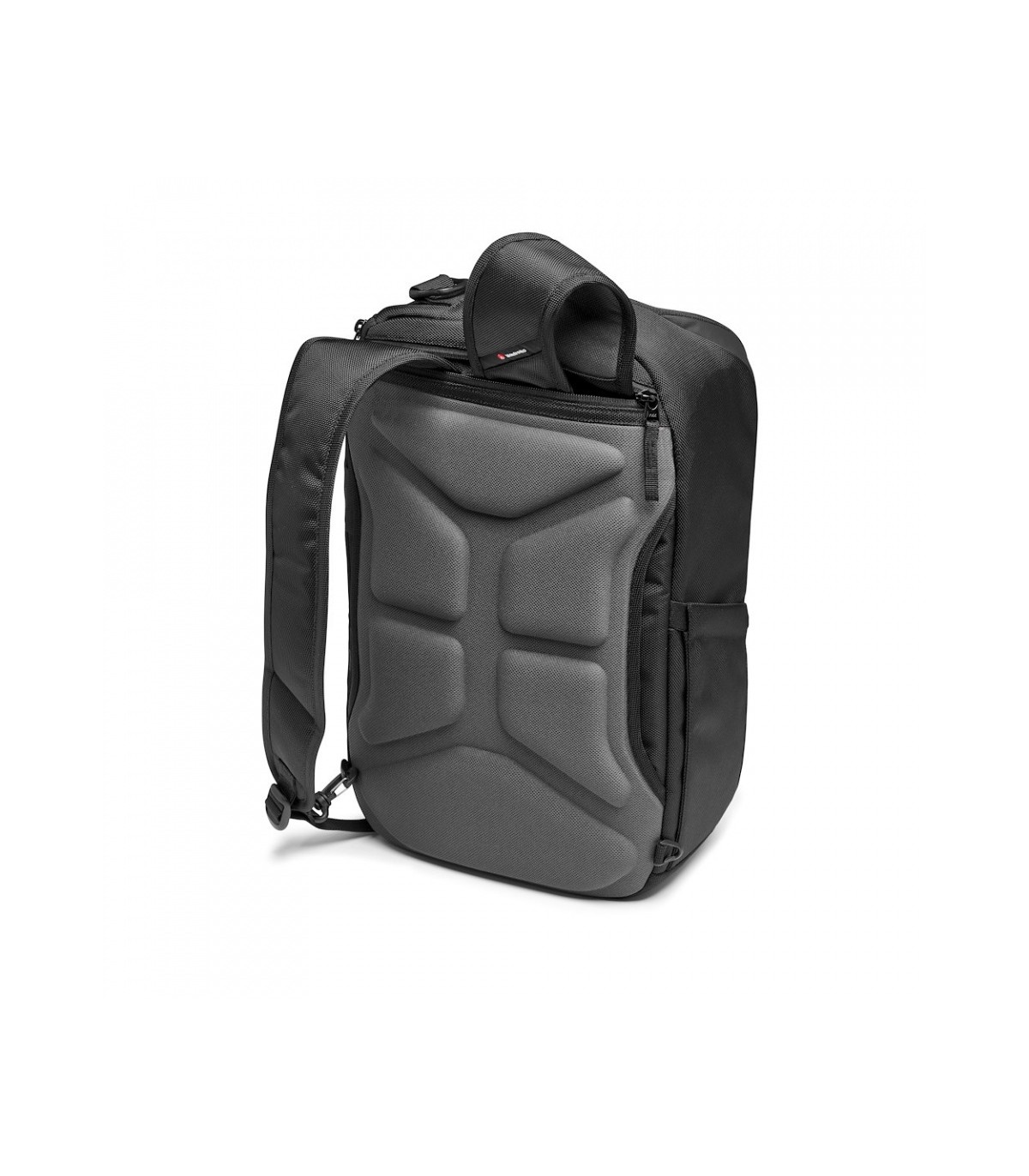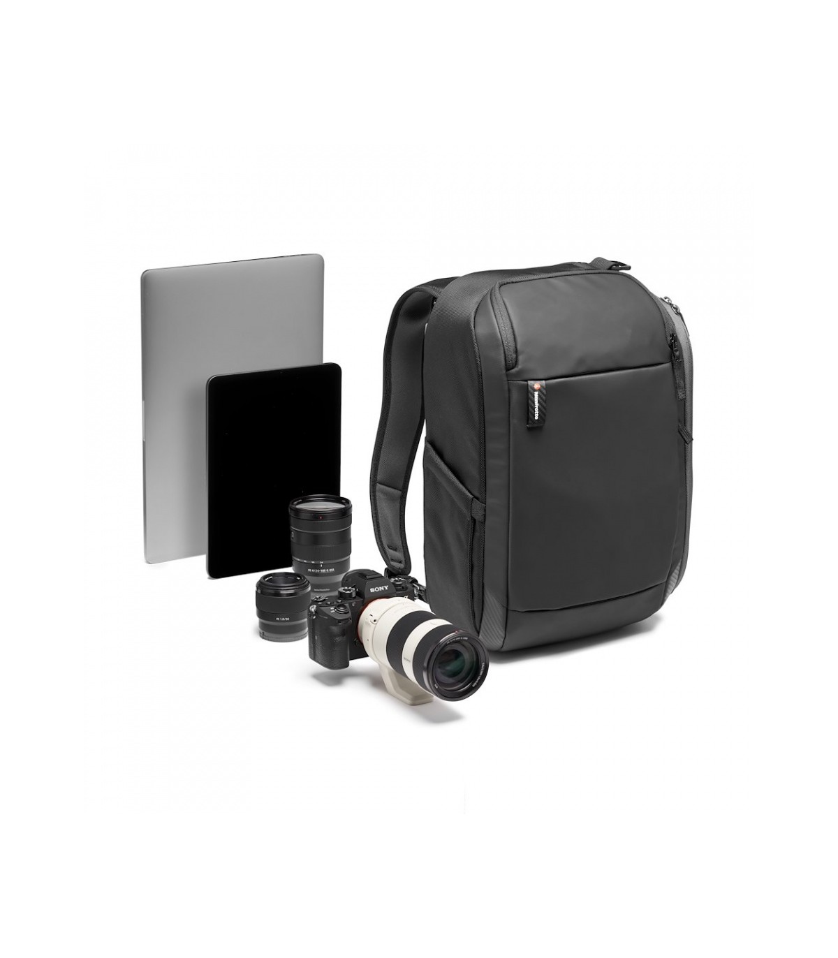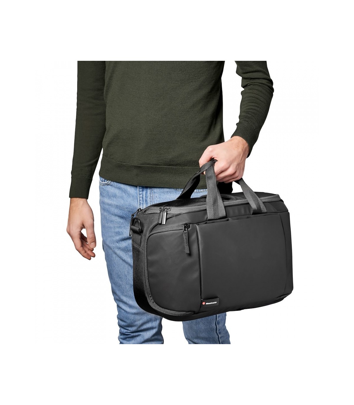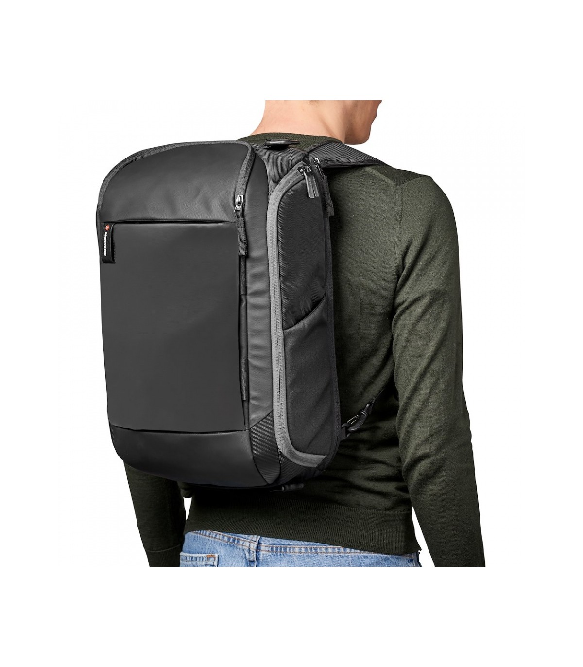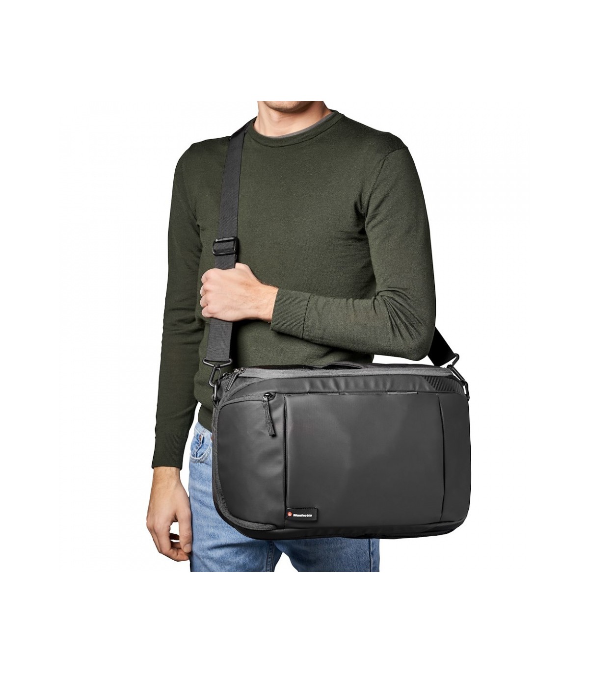 کوله پشتی چندکاره مانفروتو Advanced2 Hybrid Backpack M یک کیف همه فن حریف برای عکاسی خیابانی یا حتی مسافرت است. از این کیف می توان به عنوان کوله پشتی، کیف دوشی یا کیف دستی استفاده کرد. بند شانه ای قابل جدا شدن است و بندهای کوله نیز با زیپ به کیف بسته می شود. فضای داخلی این کیف برای حمل یک دوربین DSLR یا بدون آیینه به همراه دو عدد لنز متوسط کافی است. البته فضای زیادی برای وسایل شخصی نیز در نظر گرفته شده است. برای حمل لپتاپ نیز یک محفظه پد دار تعبیه شده که برای دستگاه هایی تا سایز 14 اینچ مناسب است. تمام رویه این کوله پشتی از الیاف مقاوم در برابر آب تشکیل شده است؛ اگرچه یک کاور باران نیز به همراه این محصول ارائه شده است.