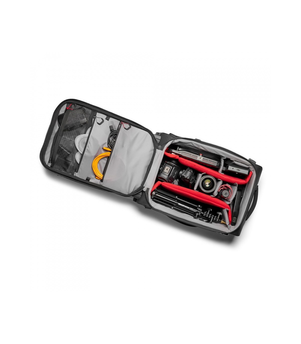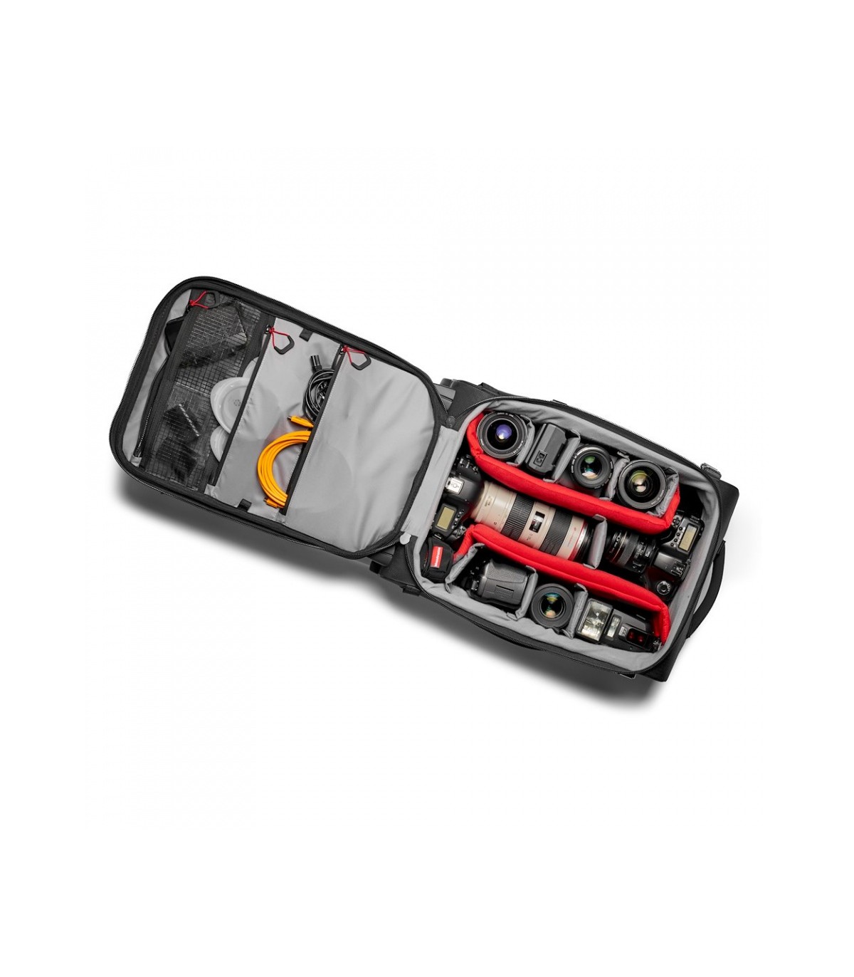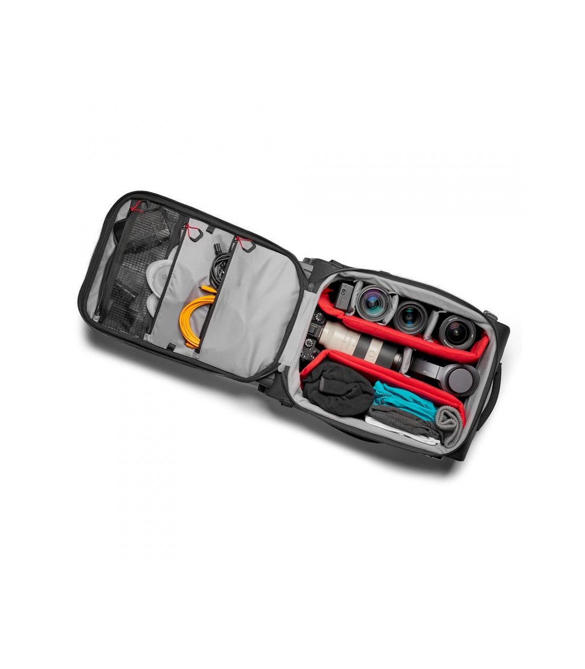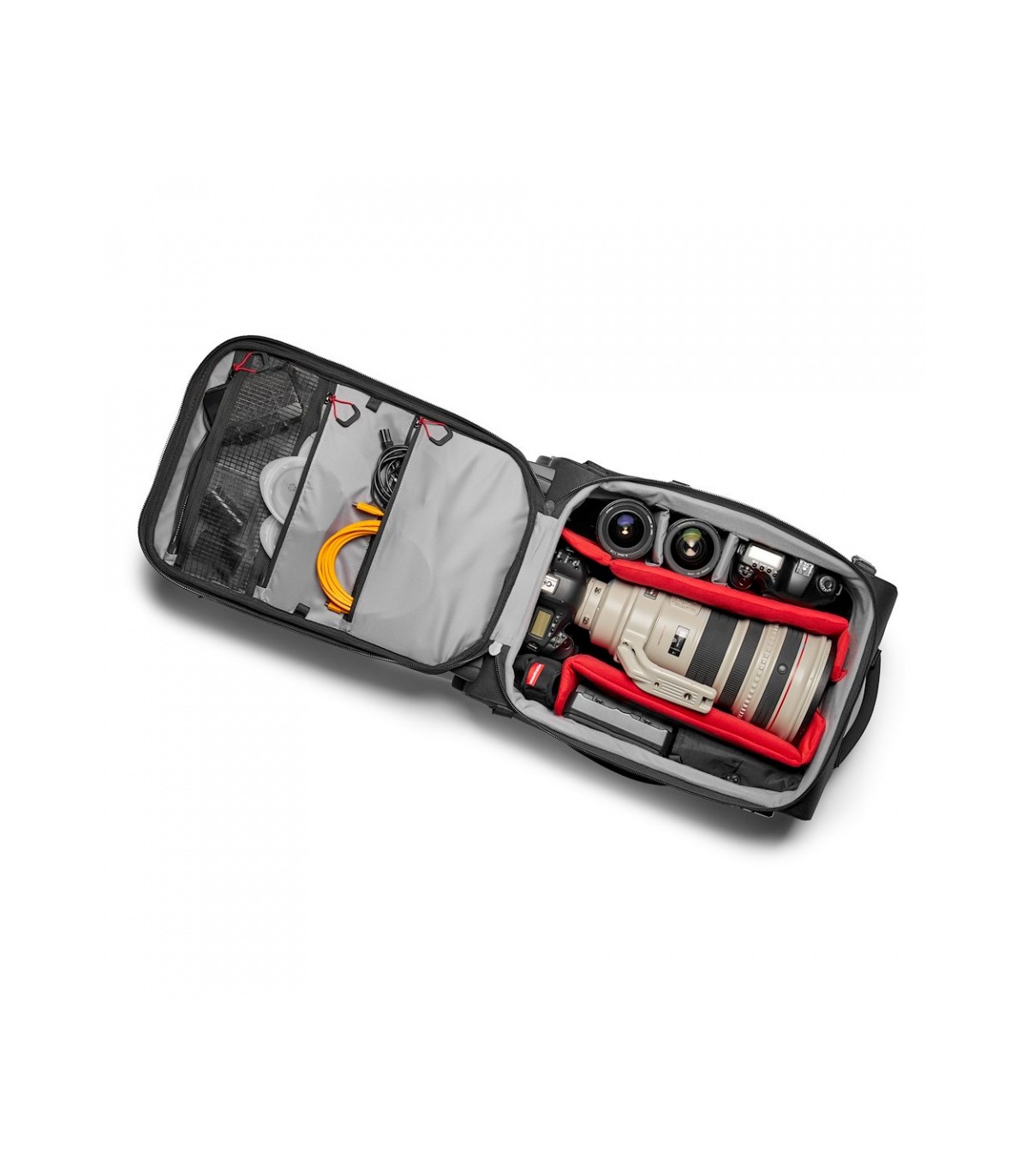 کوله پشتی چرخدار مانفروتو Pro Light Reloader Switch 55 carry-on با توجه به نیازهای عکاسان و فیلمبردارانی که همواره در سفر هستند طراحی شده تا نیاز آن ها برای حمل دوربین های DSLR یا فیلبرداری را به خوبی برآورده کند. در قسمت بیرونی این کوله پشتی از الیاف Rip-Stop استفاده تا در برابر پارگی مقاوم باشد. گوشه های این کوله پشتی تقویت شده و لایه داخلی از جنس فوم EVA است تا همزمان بتوان به عنوان یک چمدان نیز روی آن حساب کرد. بندهای کوله پشتی در جیب مخصوصی قرار گرفته اند تا تنها در مواقع نیاز آن ها را خارج کرد. این کوله پشتی به 14 جدا کننده محافظتی و 2 جداکننده مخصوص مجهز شده که همگی قابل تنظیم هستند. دو جیب شفاف نیز برای قرار دادن کابل و لوازم جانبی در قسمت داخلی آن تعبیه شده است. به طور کلی می توان از این چمدان برای حمل موارد زیر استفاده کرد: