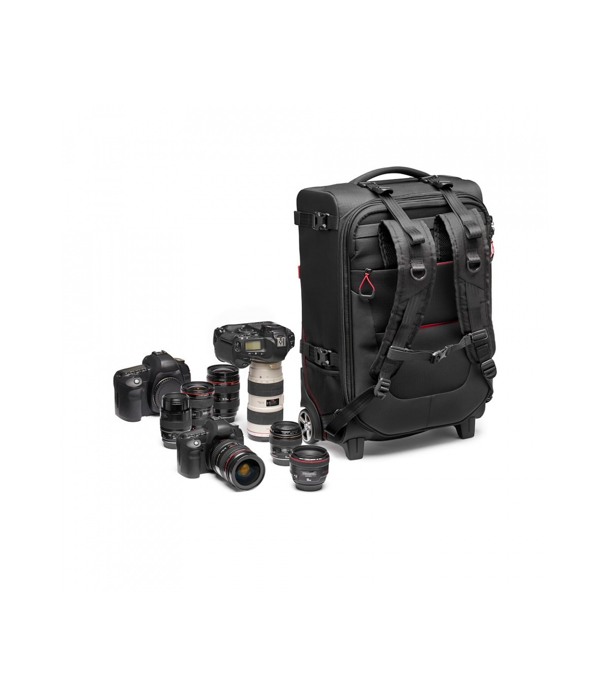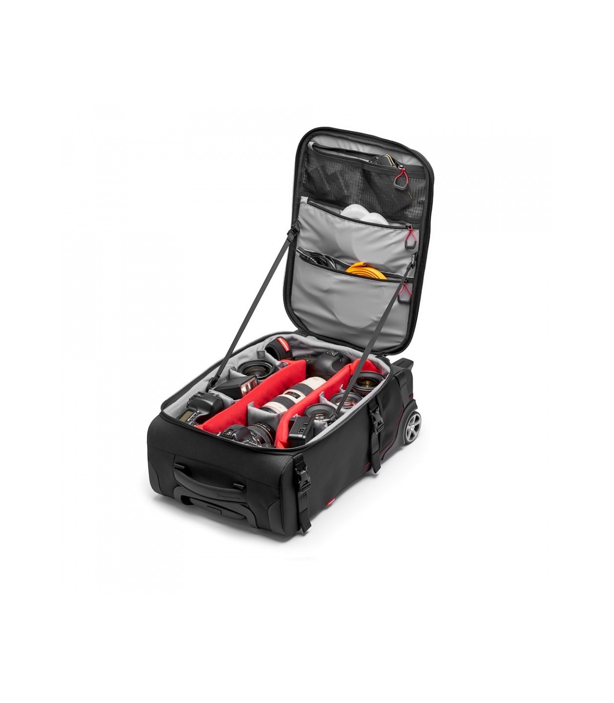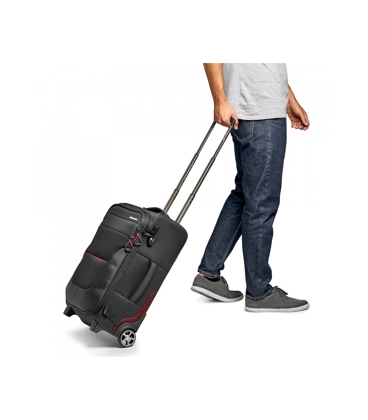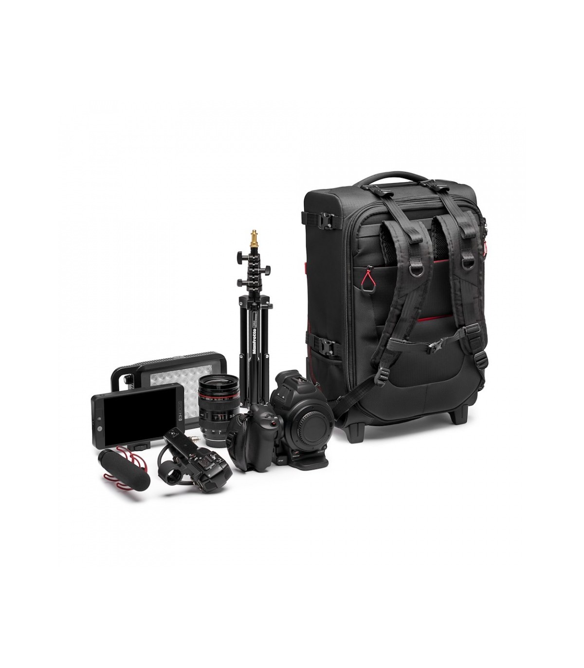 کوله پشتی چرخدار مانفروتو Pro Light Reloader Switch 55 carry-on با توجه به نیازهای عکاسان و فیلمبردارانی که همواره در سفر هستند طراحی شده تا نیاز آن ها برای حمل دوربین های DSLR یا فیلبرداری را به خوبی برآورده کند. در قسمت بیرونی این کوله پشتی از الیاف Rip-Stop استفاده تا در برابر پارگی مقاوم باشد. گوشه های این کوله پشتی تقویت شده و لایه داخلی از جنس فوم EVA است تا همزمان بتوان به عنوان یک چمدان نیز روی آن حساب کرد. بندهای کوله پشتی در جیب مخصوصی قرار گرفته اند تا تنها در مواقع نیاز آن ها را خارج کرد. این کوله پشتی به 14 جدا کننده محافظتی و 2 جداکننده مخصوص مجهز شده که همگی قابل تنظیم هستند. دو جیب شفاف نیز برای قرار دادن کابل و لوازم جانبی در قسمت داخلی آن تعبیه شده است. به طور کلی می توان از این چمدان برای حمل موارد زیر استفاده کرد:
