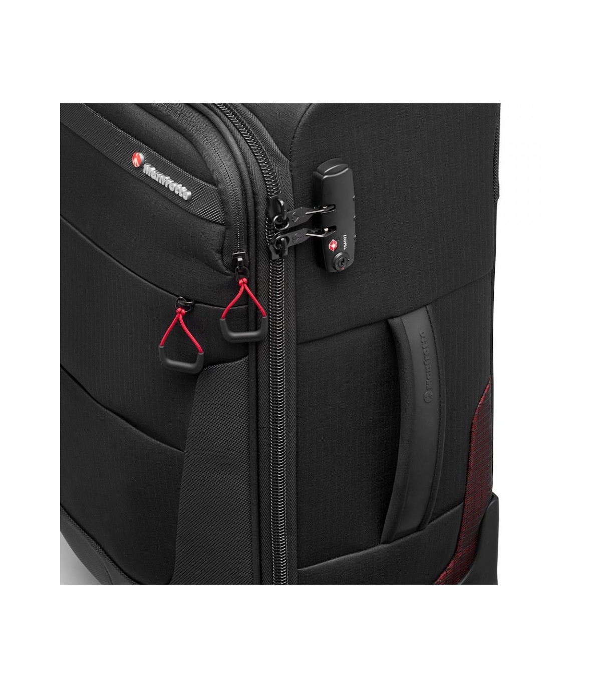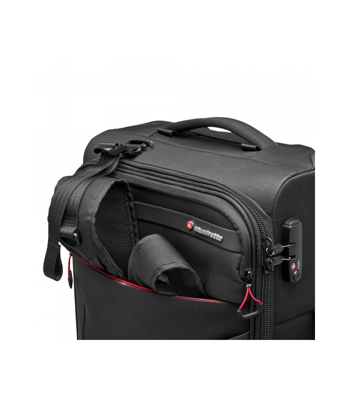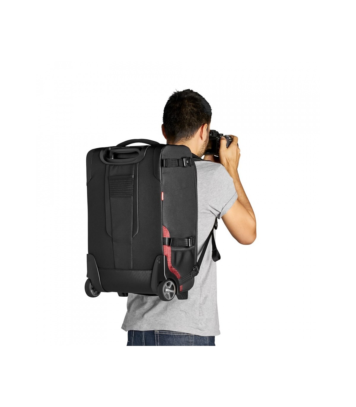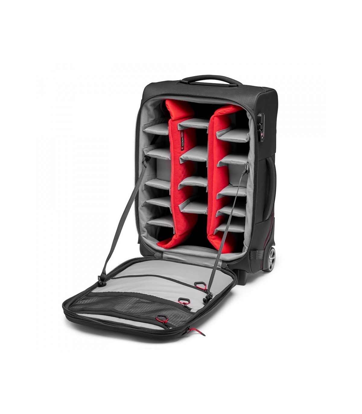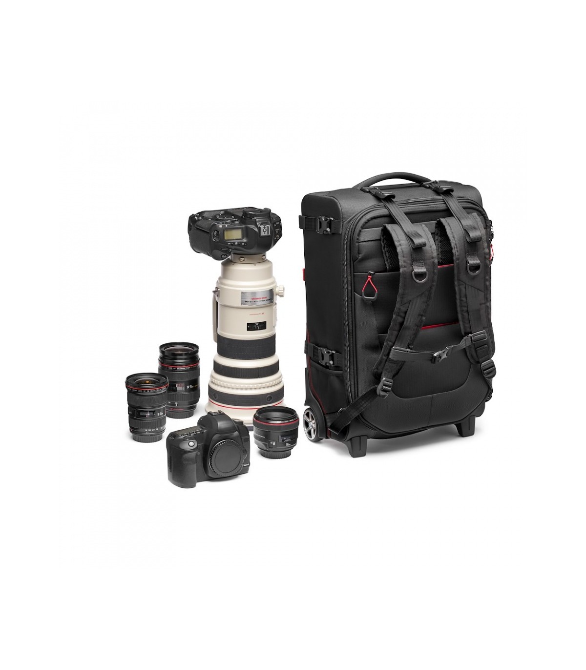 کوله پشتی چرخدار مانفروتو Pro Light Reloader Switch 55 carry-on با توجه به نیازهای عکاسان و فیلمبردارانی که همواره در سفر هستند طراحی شده تا نیاز آن ها برای حمل دوربین های DSLR یا فیلبرداری را به خوبی برآورده کند. در قسمت بیرونی این کوله پشتی از الیاف Rip-Stop استفاده تا در برابر پارگی مقاوم باشد. گوشه های این کوله پشتی تقویت شده و لایه داخلی از جنس فوم EVA است تا همزمان بتوان به عنوان یک چمدان نیز روی آن حساب کرد. بندهای کوله پشتی در جیب مخصوصی قرار گرفته اند تا تنها در مواقع نیاز آن ها را خارج کرد. این کوله پشتی به 14 جدا کننده محافظتی و 2 جداکننده مخصوص مجهز شده که همگی قابل تنظیم هستند. دو جیب شفاف نیز برای قرار دادن کابل و لوازم جانبی در قسمت داخلی آن تعبیه شده است. به طور کلی می توان از این چمدان برای حمل موارد زیر استفاده کرد: