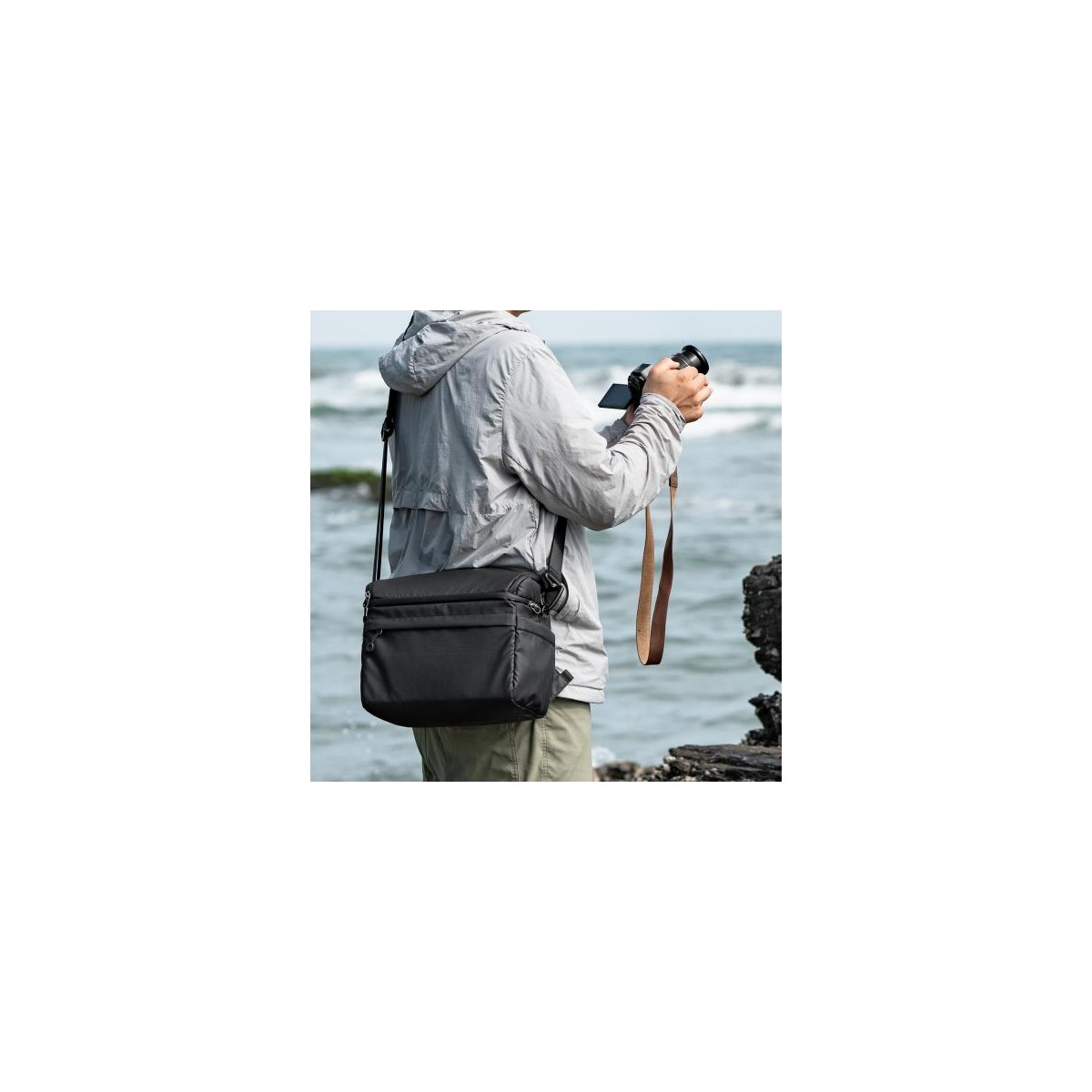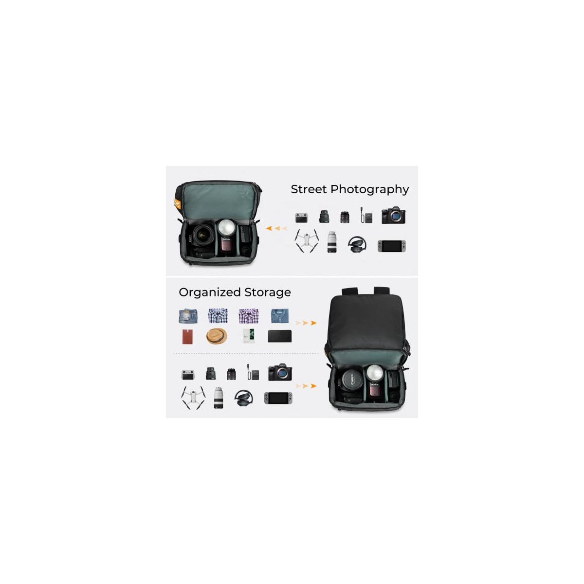 امکان خارجکردن سریع دوربین و ثبت لحظه وقتی که از کیف به حالت شانهآویز استفاده میکنید و امکان قراردادن لوازم همراه خود در بخش بالایی و قراردادن دوربین در بخش پایینی کیف وقتی که از کیف به حالت کوله پشتی استفاده میکنید.