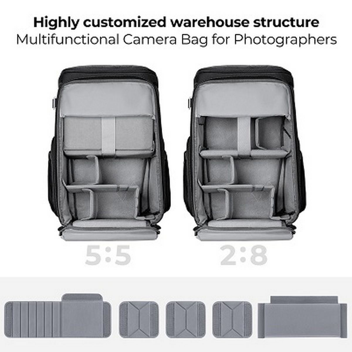 کوله پشتی K&F13.128V3 دارای محفظهای بزرگ با دیوایدرهای پددار قابل تنظیم است. این ویژگی به شما اجازه میدهد فضای داخلی را مطابق با اندازه دوربین، لنزها، فلاش، باتری و سایر لوازم جانبی سفارشیسازی کنید. در عین حال، پدهای نرم از تجهیزات در برابر ضربه و لرزش محافظت میکنند.