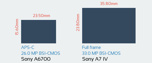 سونی A6700 دارای حسگر BSI-CMOS با اندازه ۲۶.۰ مگاپیکسل APS-C (با اندازه ۲۵.۵×۱۵.۵) و پردازنده Bionz XR است. از سوی دیگر، سونی A7 IV دارای حسگر BSI-CMOS با اندازه ۳۳.۰ مگاپیکسل فولفریم (۳۵.۸×۲۳.۸ میلیمتر) و پردازنده Bionz XR است.