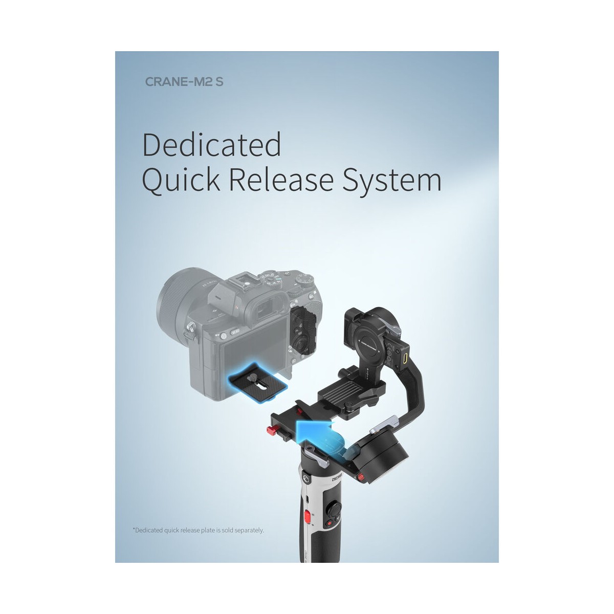 گیمبال CRANE-M2 S دارای یک صفحه آزادسازی سریع دوربین است که امکان اتصال و جداسازی دوربین را تنها با فشار دادن یک دکمه در اختیار کاربران گذاشته است. درجهبندیها قفلهای حافظهدار امکان کالیبره کردن و نگه داشتن تنظیمات مربوطه را برای دستگاههای مختلف فراهم کرده است. نور داخلی موجود بر روی گیمبال دارای استاندارد CRI مثبت ۹۰، هزار لومن روشنایی، ۵ درجه مختلف روشنایی و چهار فیلتر رنگی است.