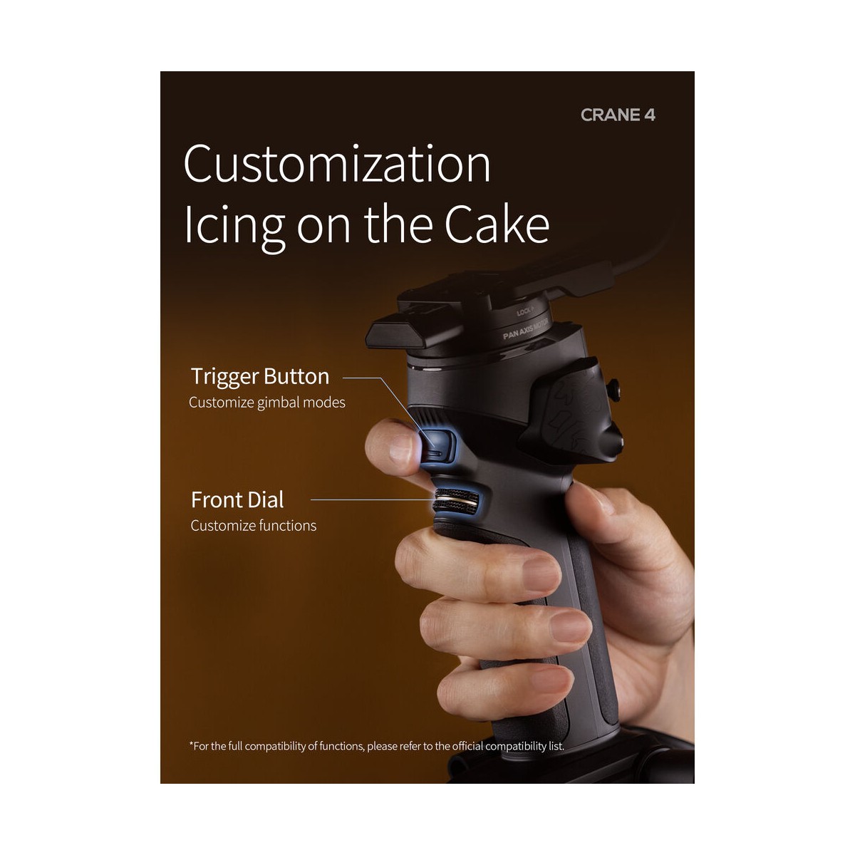 مهمترین ویژگی ژیون کرین 3S ، طراحی متفاوت و کاربردی دسته آن است. این دسته دارای یک بخش قابل جدا شدن است که امکان استفاده از محصول را با دو دست ممکن میسازد. بدین ترتیب کاربر کنترل بیشتر و بهتری روی گیمبال، حرکت دادن آن و به طبع زاویه و کادربندی فیلمبرداری خواهد داشت. همچنین دست کاربر را در کادربندی در زوایای مختلف و بعضاً دشوار، باز میگذارد. در بخش انتهایی دسته جداشونده، دکمههایی برای تنظیم و کنترل محصول قرار دارند که در این میان یک جویاستیک و یک نمایشگر OLED کوچک نیز قرار دارد. جهت کنترل گیمبال دو آپشن برای کاربر وجود دارد که یکی از آنها استفاده از دسته جداشونده همراه با دکمههای کنترلی است و دیگری استفاده از گیمبال بدون دسته و دکمههای کنترلی است که با توجه به موقعیت، نوع کاربرد و نیازها میتوانید از هرکدام از این حالتها استفاده نمایید.