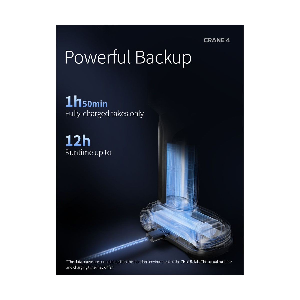 وزن Crane 3S کمتر از ۲.۵ کیلوگرم است که این مورد امکان استفاده طولانیمدت و راحت از آن را فراهم میسازد ضمن اینکه باتری قوی آن امکان استفاده مداوم تا دوازده ساعت را در اختیار کاربر قرار میدهد. وظیفه تأمین انرژی گیمبال بر عهده ۳ باتریای است که در جعبه این محصول قرار دارد. با استفاده از این باتریها میتوانید تا ۱۲ ساعت با این گیمبال به فیلمبرداری بپردازید. اگر هم که نیاز به منبع انرژی برای مدتزمان بیشتری دارید، میتوانید تا از طریق درگاه DC قرارگرفته روی این گیمبال، آن را به باتری پک خارجی متصل کنید. به این منظور میتوانید از باتری پک Transmount PowerPlus بهره ببرید که از ۶ باتری ۱۸۶۵۰ تشکیل شده است. بدین ترتیب علاوه بر ۱۲ ساعت کار با باتری داخلی، میتوانید تا ۱۸ ساعت هم با این باتری پک به کار بپردازید.