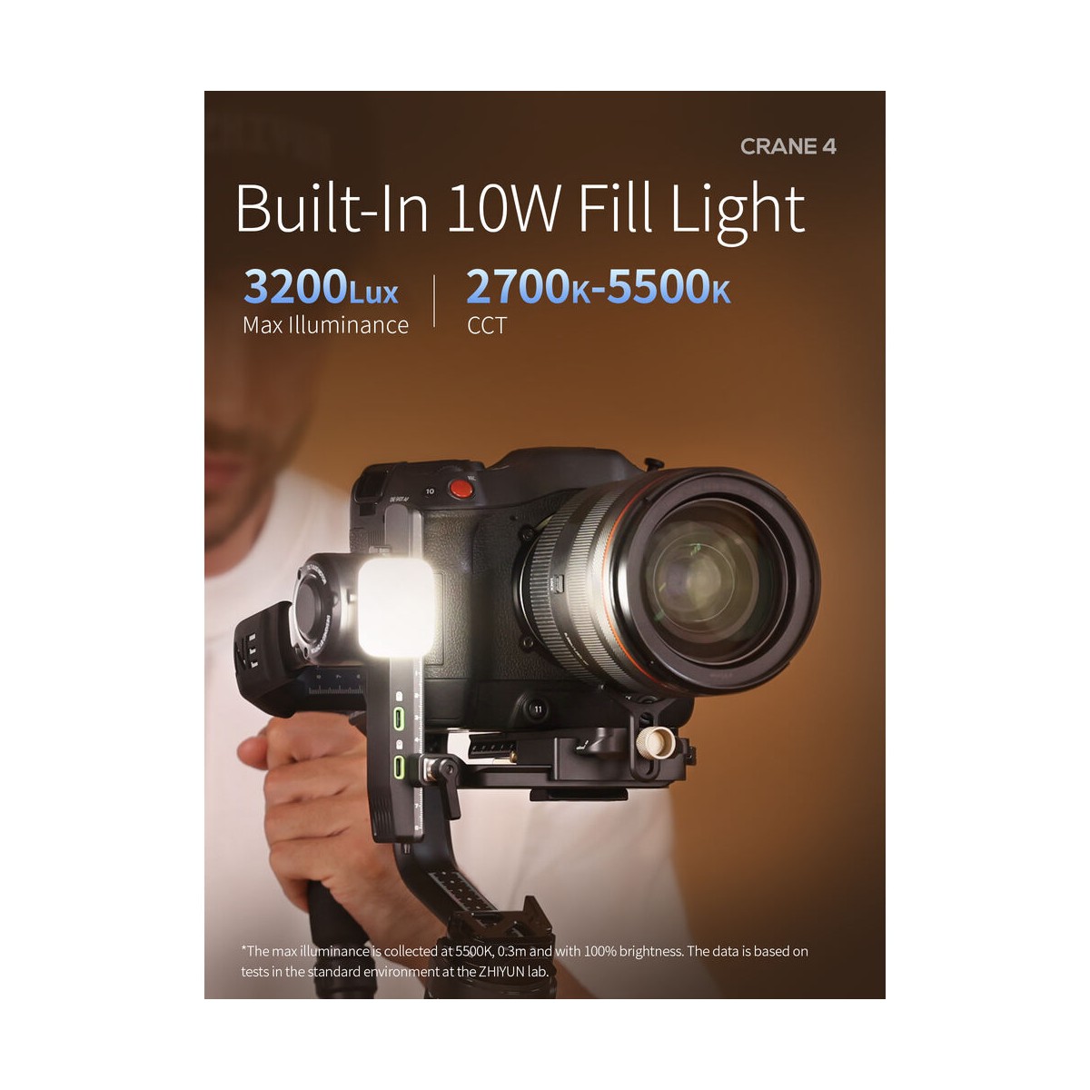 - گیمبال CRANE 4 مجهز به یک نور داخلی ۱۰ واتی است که قادر است ۳۲۰۰ لوکس روشنایی در اختیار بگذارد. یک دیفیوزر همراه این نور عرضه شده که با استفاده از آن میتوانید خروجی نرمتری از نور دریافت کنید.