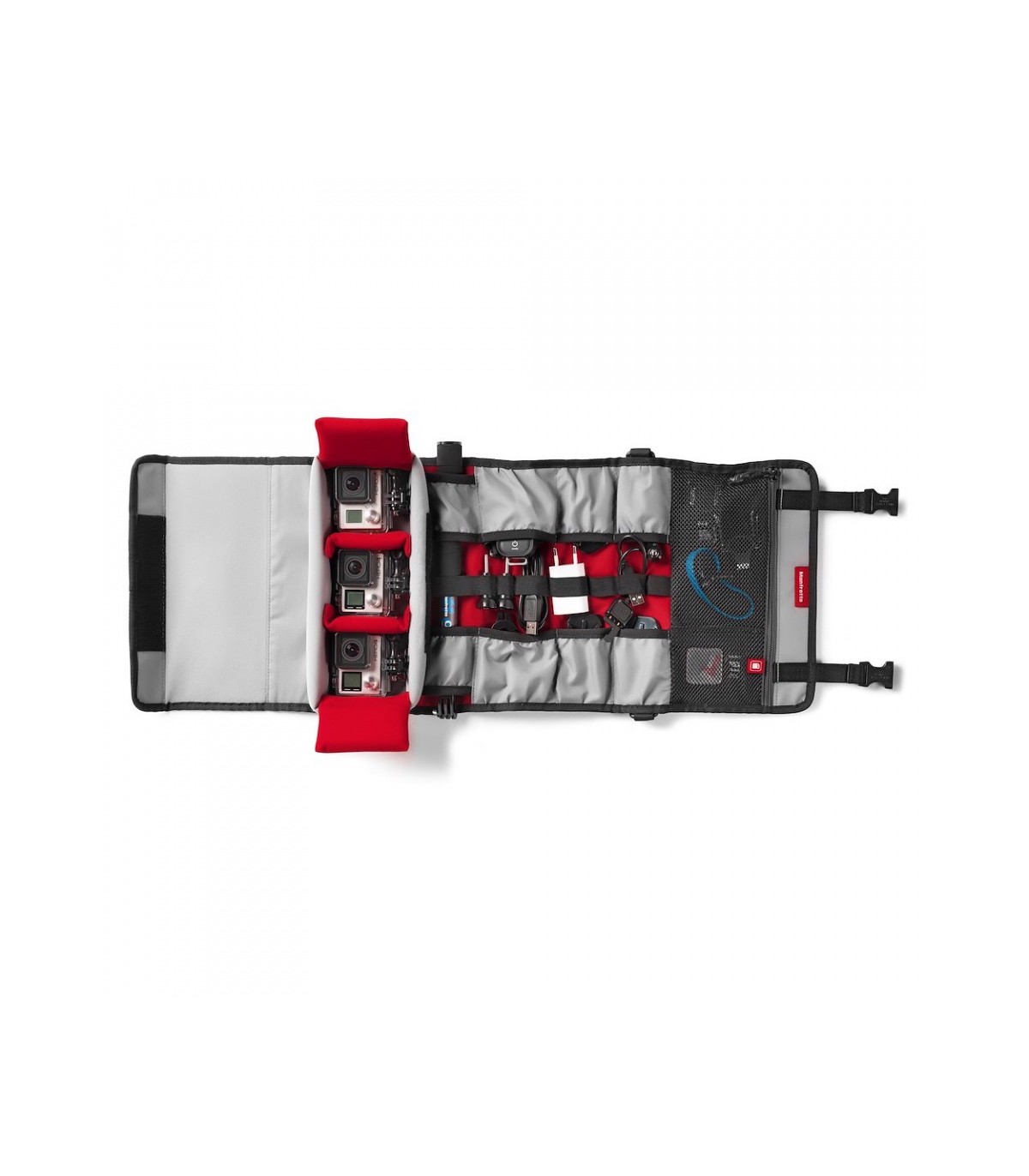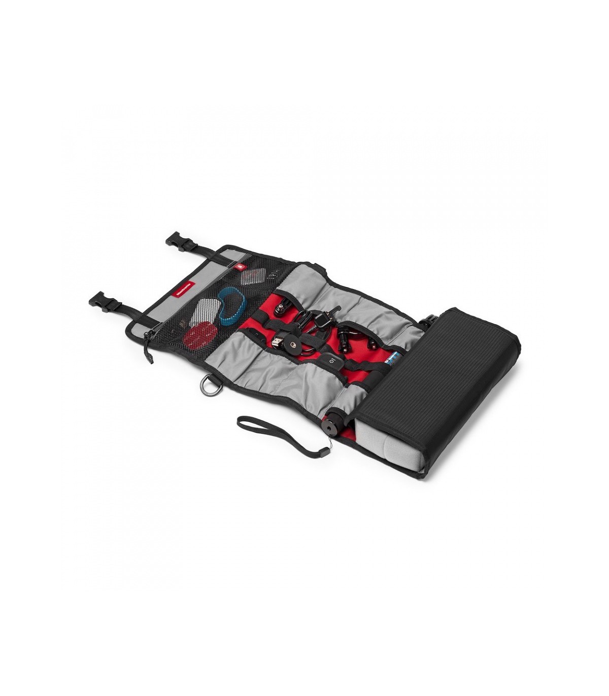 کیف دستی مانفروتو Offroad Stunt Roll Organiser for Action Cameras یک کیف چندمنظوره با قابلیت لوله شدن برای حمل 3 دوربین ورزشی و تجهیزات آن هاست. طراحی این کیف از جنس نرم اما مخصوص است تا محتویات درون آن همواره در امان باشند. فضای کافی برای حمل لوازم جانبی و وسایل شخصی نیز وجود دارد. به لطف وجود جداکننده های قابل تنظیم و پدهای ضربه گیر درون این کیف، قابلیت حمل دوربین GoPro یا دوربین های دیگر با ابعاد متفاوت هم وجود دارد. مواد اولیه مورد استفاده در این محصول همگی از بالاترین کیفیت ممکن هستند تا دوام و راحتی آن تضمین شود. جیب های داخل این کیف برای قرار دادن کابل و شارژر مناسب هستند و برای محکم نگه داشتن وسایل کوچکتر می توان از کش های نگهدارنده تعبیه شده استفاده کرد. یک قسمت مخصوص نیز برای قرار دادن سه پایه های کوچک یا مونوپاد در نظر گرفته شده تا مجموعه ای کامل از تجهیزات آماده سفر باشند. وزن این کیف بسیار سبک است و همین موضوع استفاده از آن را برای سفرهای کوتاه یا ماجراجویی در دل طبیعت مناسب می کند.