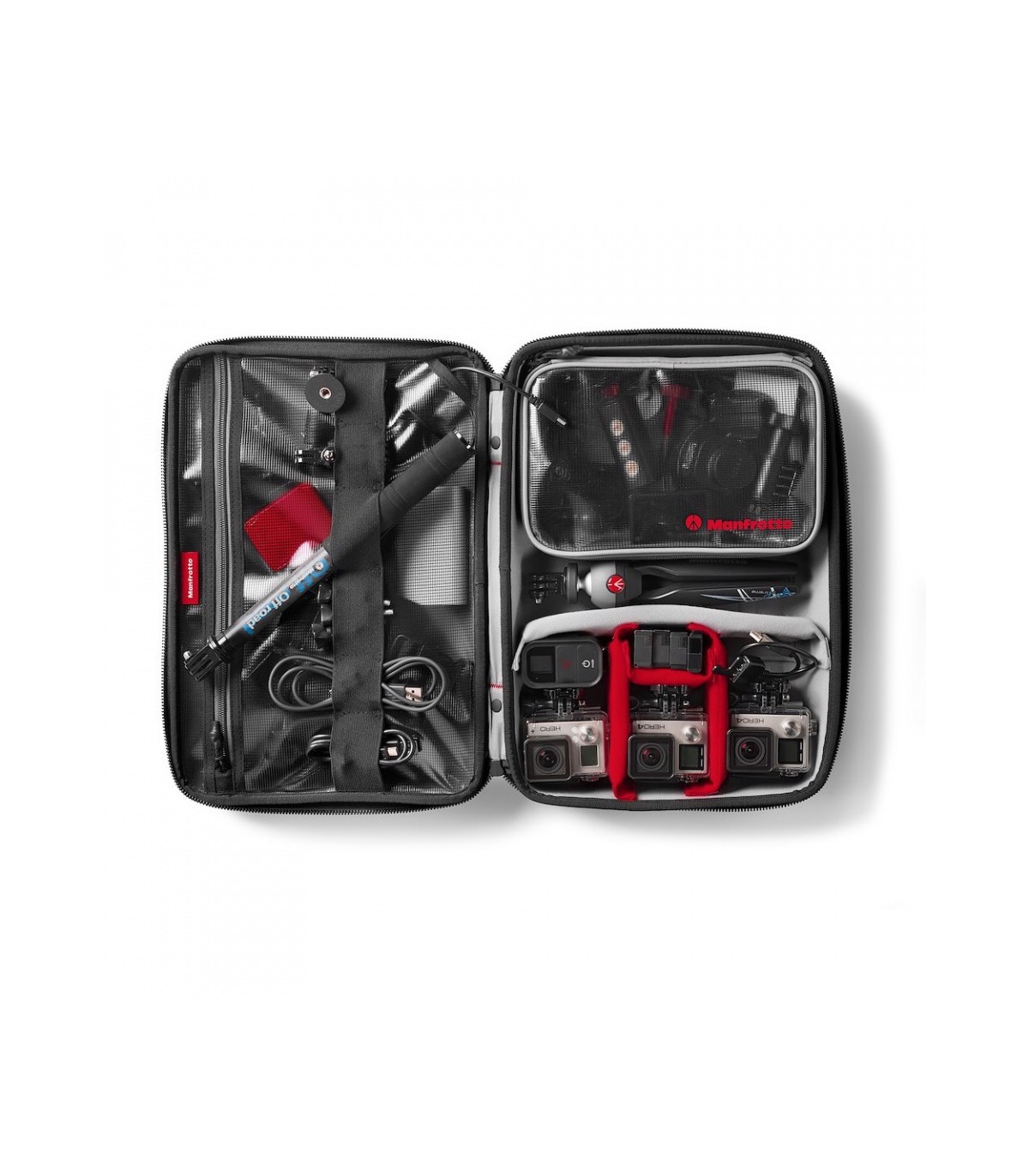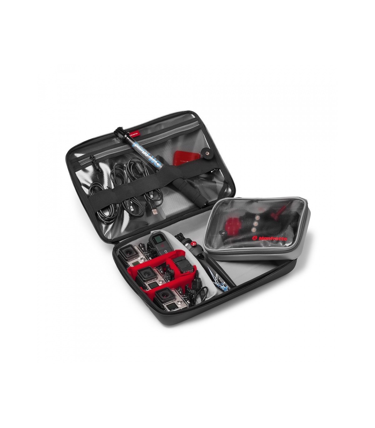 کیف دستی مانفروتو Offroad Stunt case for Action Cameras یک کیف با دوام و چندمنظوره برای حمل 3 دوربین ورزشی و تجهیزات آن هاست. طراحی این کیف به صورت ضد آب و ضد له شدگی است تا محتویات درون آن همواره در امان باشند. فضای کافی برای حمل لوازم جانبی و وسایل شخصی نیز وجود دارد. به لطف وجود جداکننده های قابل تنظیم درون این کیف، قابلیت حمل دوربین GoPro یا دوربین های دیگر با ابعاد متفاوت هم وجود دارد. مواد اولیه مورد استفاده در این محصول همگی از بالاترین کیفیت ممکن هستند تا دوام و راحتی آن تضمین شود. یک کیسه شفاف نیز برای حمل تجهیزاتی مانند LCD BacPac، ریموت کنترل، باتری اضافه و کارت حافظه نیز به همراه این محصول ارائه شده است. برای قرار دادن کابل ها، سه پایه های کوچک یا مونوپاد نیز یک کش در داخل درب کیف تعبیه شده است.