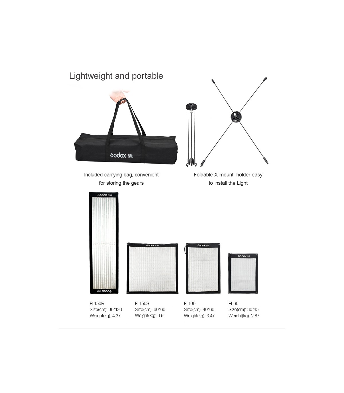 نور LED انعطافپذیر Godox مدل FL150R نیز محصول همین کمپانی بوده که دارای طراحی منحصربهفردی میباشد. ویژگی اصلی و برجسته این محصول طراحی انعطافپذیر آن است که موجب شده در موارد بسیار گوناگونی بتوانید از آن بهره ببرید. این ویژگی در طراحی محصول فوق باعث شده بتوانید در مواردی که به دلیل دسترسی نامناسب امکان نورپردازی مناسب ندارید نیز با استفاده از این محصول نیاز خود را برطرف سازید.