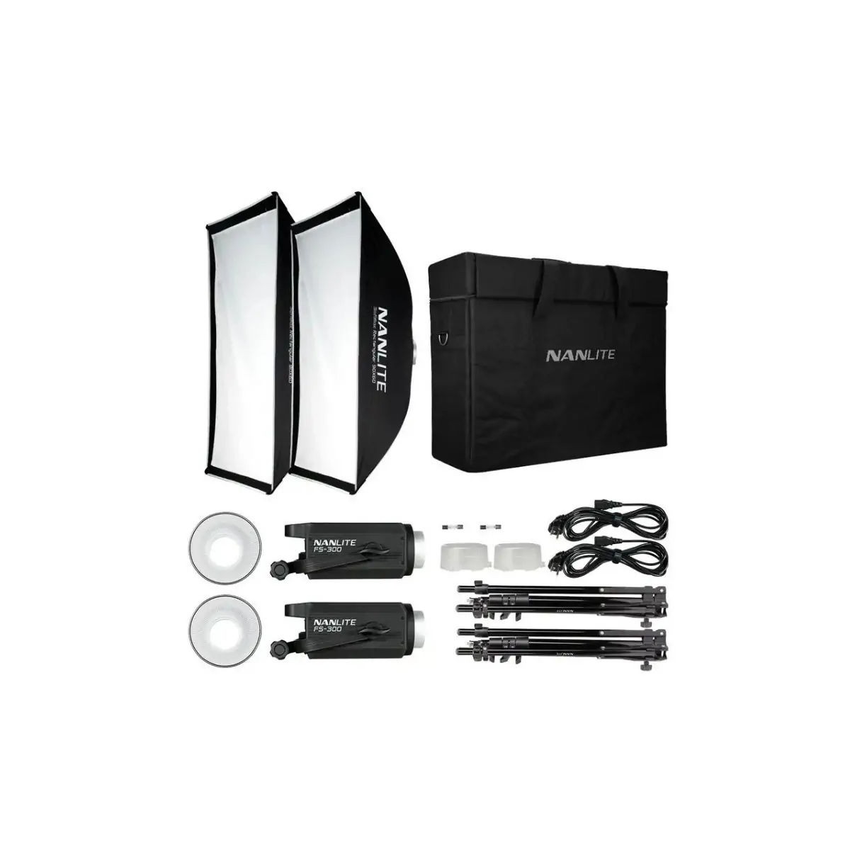 کیت شامل: دو عدد FS-300، دو عد کاسه رفلکتور، دو عدد درپوش الایدی، دو عدد سافت باکس ۶۰×۹۰ سانتیمتر، دو عدد سهپایه نور، دو عدد کابل برق و کیف برای جابهجایی