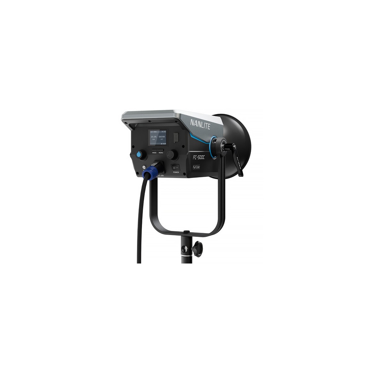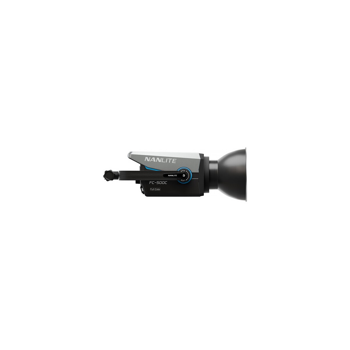 Nanlite FC500C با مانت استاندارد Bowens-S عرضه میشود؛ به این معنا که طیف گستردهای از لوازم جانبی مانند سافتباکسها، بیوتیدیشها، رفلکتورها و سایر اصلاحکنندههای نور بهراحتی روی آن نصب میشوند. این ویژگی باعث میشود کاربران به لوازم اختصاصی گرانقیمت محدود نباشند و از تجهیزات رایج بازار استفاده کنند. از نظر طراحی، بدنهی دستگاه با وجود توان بالا همچنان فشرده است. ابعاد آن حدود ۳۸ × ۲۵ × ۱۵ سانتیمتر و وزنش در حدود ۳.۹ کیلوگرم است. یوک فلزی با قابلیت چرخش ۳۶۰ درجه نیز امکان تنظیم زاویهی تابش نور در هر شرایطی را به سادگی فراهم میکند.