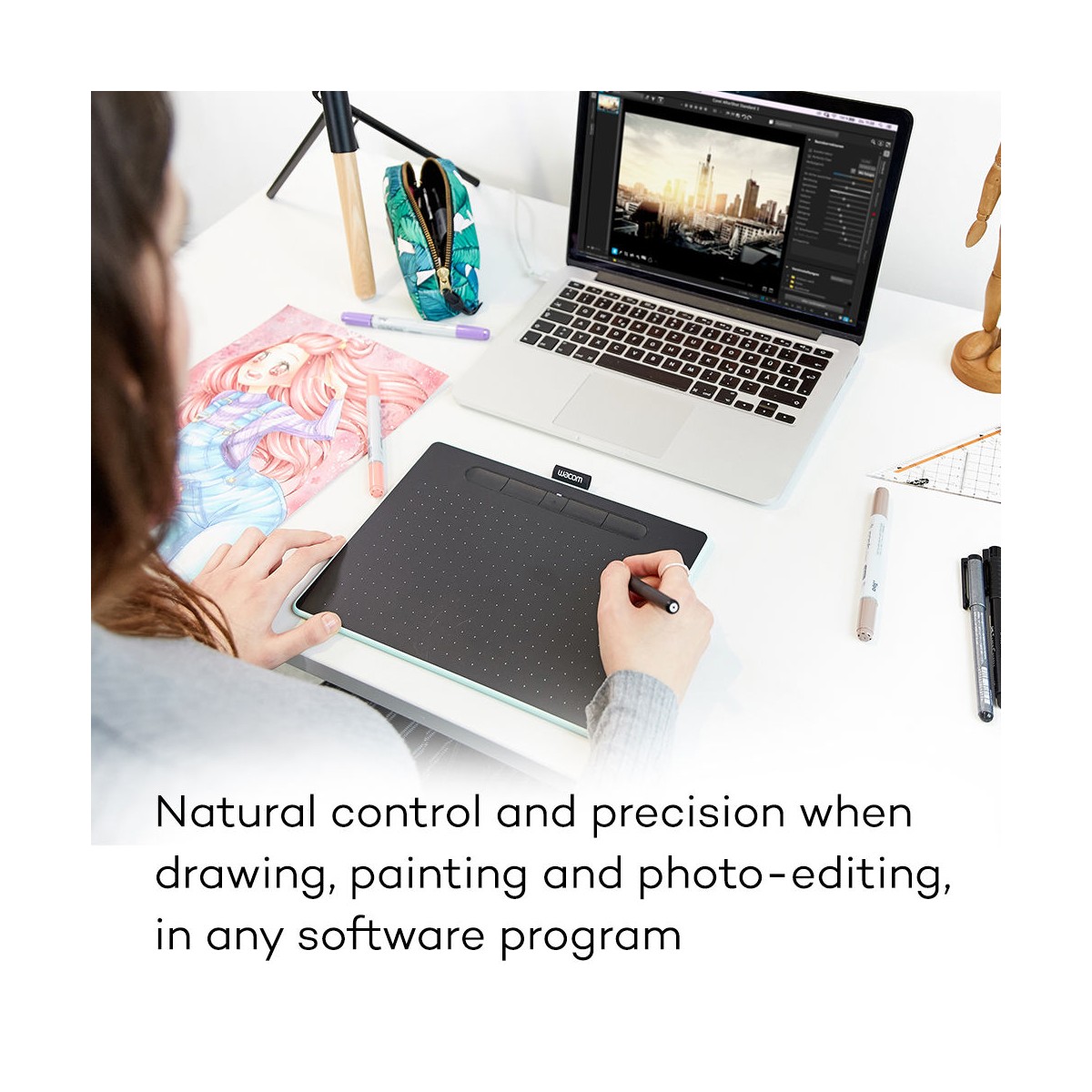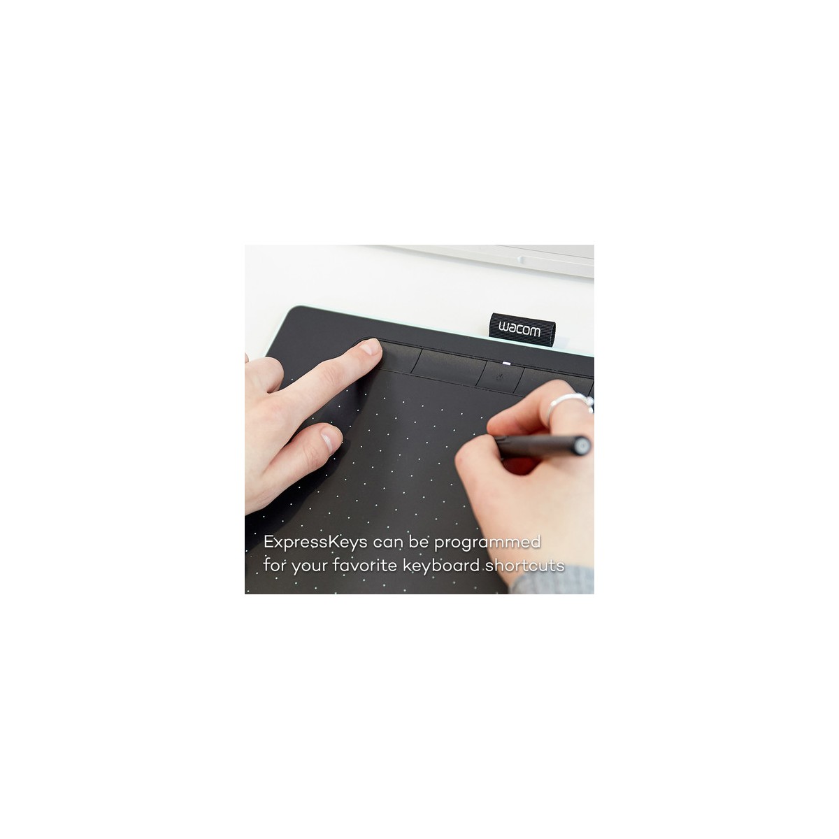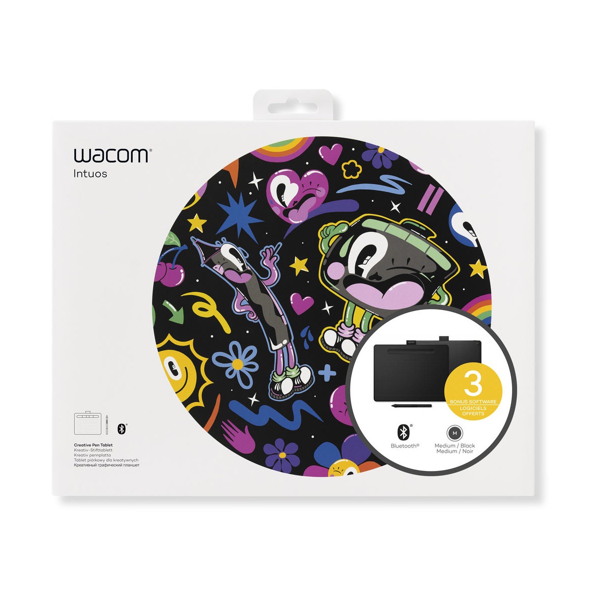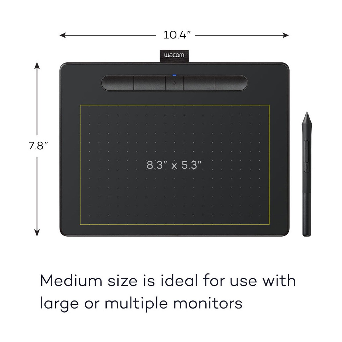 تبلت گرافیکی Intuos Creative Pen در اندازه مدیوم یک ابزار ایدهآل برای ثبت ایدهها و آثار هنری بهصورت دیجیتال است. این تبلت دارای فضای فعال طراحی به ابعاد ۸.۵×۵.۳ اینچ است و هم برای راستدستها و هم برای چپدستها، قابل استفاده است. چهار کلید قابل برنامهدهی بر روی این تبلت قرار گرفته است که میتوانید آنها را بر روی پرکاربردترین دستورات مانند Copy، Paste و یا Undo تنظیم کنید. یک قلم استایلوس حساس به فشار با قابلیت شناسایی حد فشار در ۴۰۹۶ سطح مختلف نیز همراه این محصول عرضهشده است.