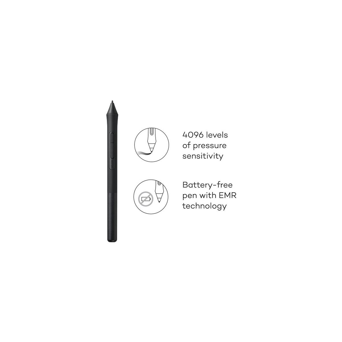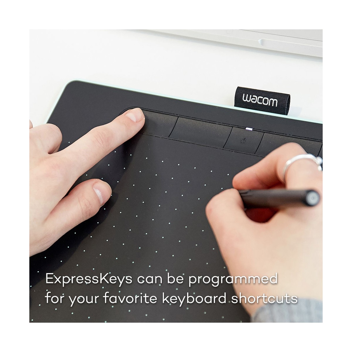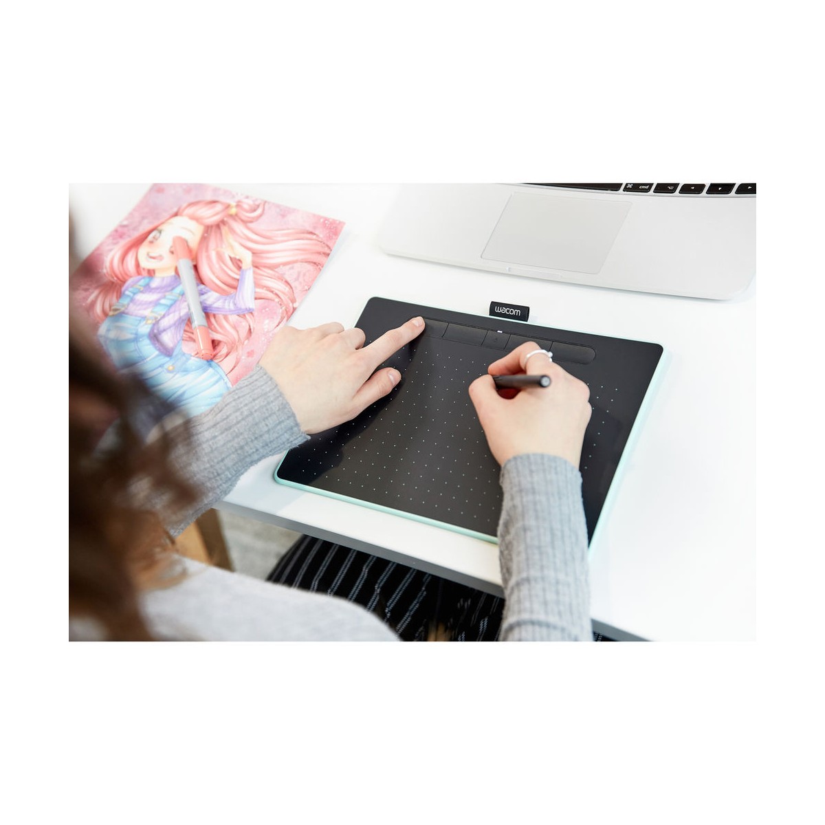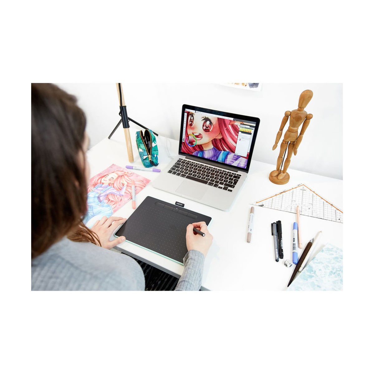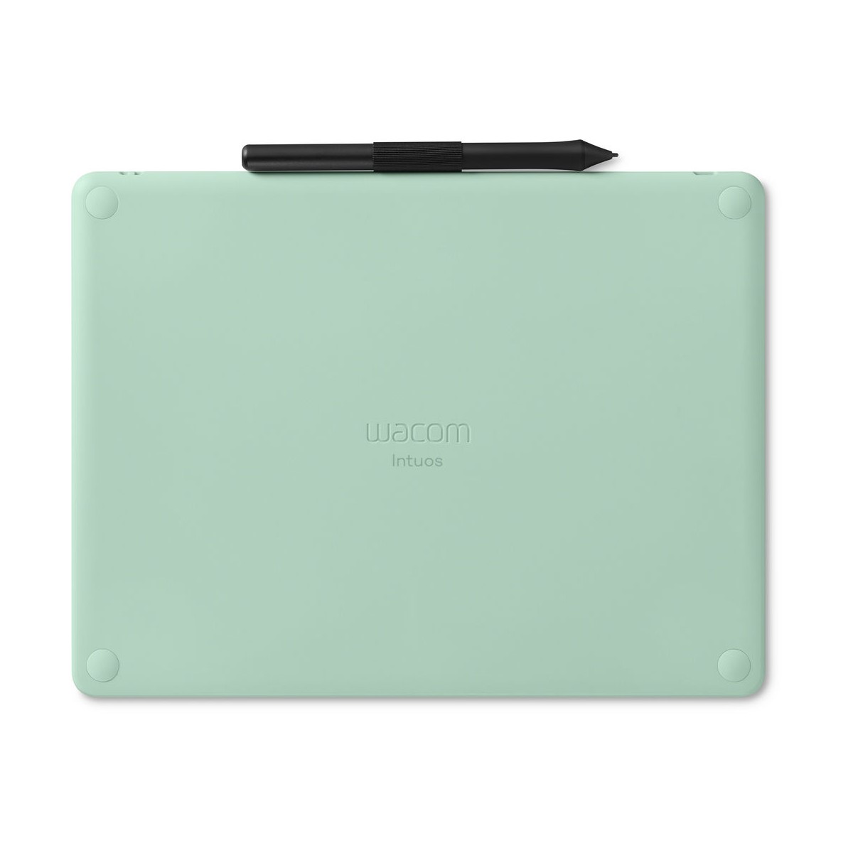 تبلت گرافیکی Intuos Bluetooth Creative Pen در اندازه مدیوم یک ابزار ایدهآل برای ثبت ایدهها و آثار هنری بهصورت دیجیتال است. این تبلت دارای فضای فعال طراحی به ابعاد ۸.۵×۵.۳ اینچ است و هم برای راستدستها و هم برای چپدستها، قابل استفاده است. چهار کلید قابل برنامهدهی بر روی این تبلت قرار گرفته است که میتوانید آنها را بر روی پرکاربردترین دستورات مانند Copy، Paste و یا Undo تنظیم کنید. یک قلم استایلوس حساس به فشار با قابلیت شناسایی حد فشار در ۴۰۹۶ سطح مختلف نیز همراه این محصول عرضهشده است. با رجیستر کردن این تبلت میتوانید بهصورت رایگان اقدام به دانلود نرمافزارهای Corel Painter Essential نسخه ۹۰ روزه، Corel AfterShot Pro 3 نسخه ۹۰ روزه و Clip Studio Paint Pro با لایسنس ۲ ساله، کنید.