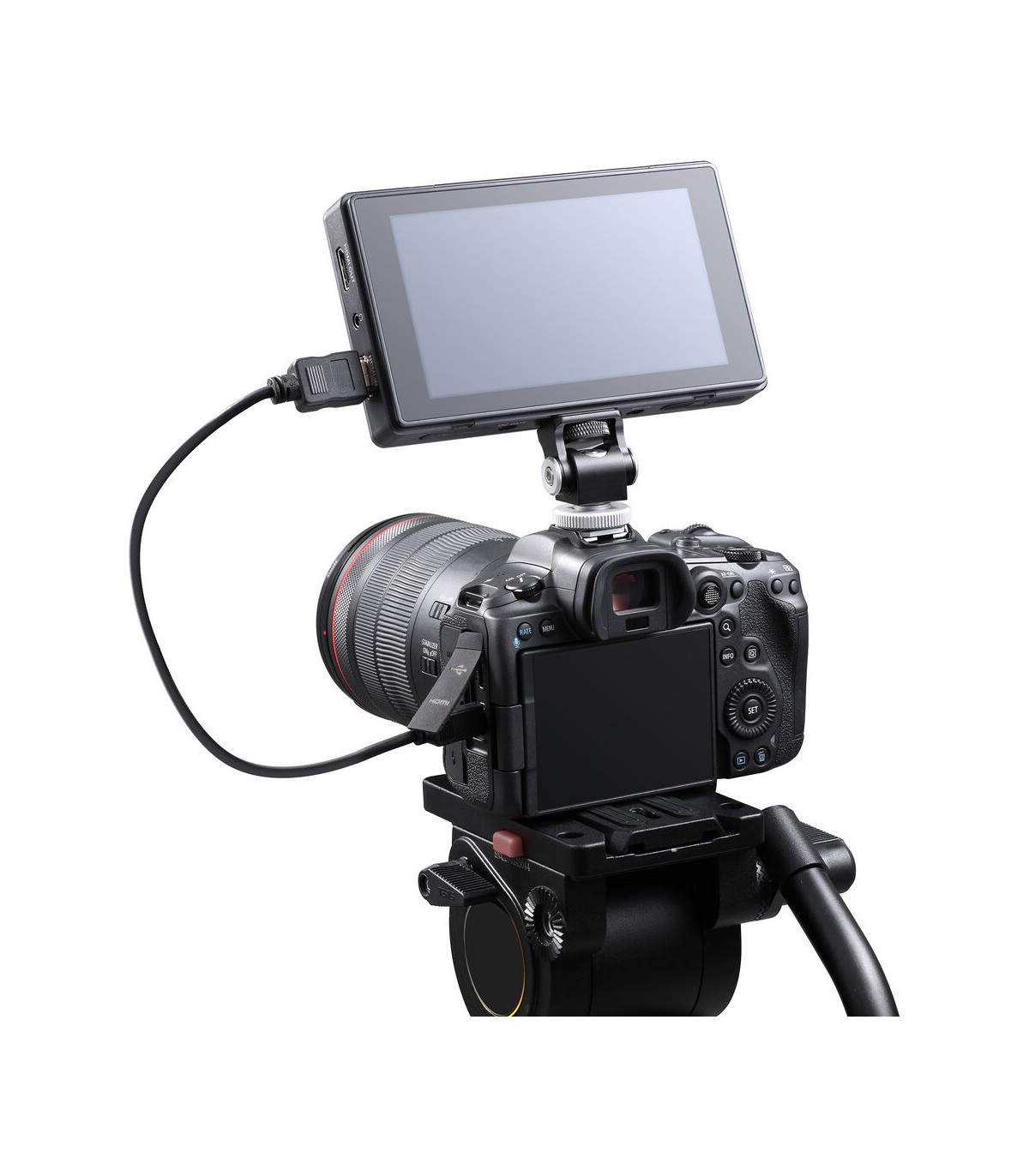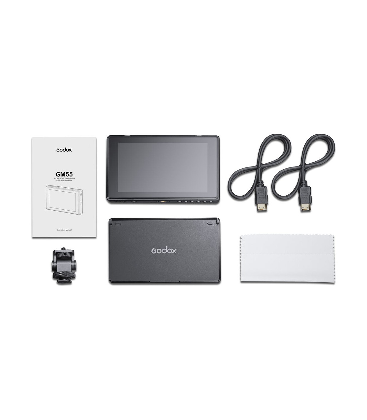 مانیتور لمسی رو دوربینی godox 5.5” 4K HDMI GM55 یک مانیتور سبک با رزولوشن 1080p و مجهز به ورودی و خروجی HDMI با پشتیبانی از سیگنال های ویدئویی تا DCI 4K24 و UHD 4K30 است. خروجی این مانیتور قابلیت اتصال یک فرستنده بیسیم برای مشاهده تصاویر روی نمایشگر های دیگر را فراهم کرده است. با استفاده از یک کابل کنترل گودکس که متناسب با دوربین باشد، می توان کنترل ضبط تصاویر یا عملکرد های دیگر را توسط مانیتور کنترل کرد. این مانیتور به همراه یک باتری صفحه ای از نوع L-Series عرضه شده ولی با استفاده از ورودی برق DC نیز می توان از آن استفاده کرد. یک خروجی DC نیز برای تأمین برق مورد نیاز برخی از دوربین های مشخص شده نیز وجود دارد. کابل های اتصال برق باید جداگانه تهیه شوند.