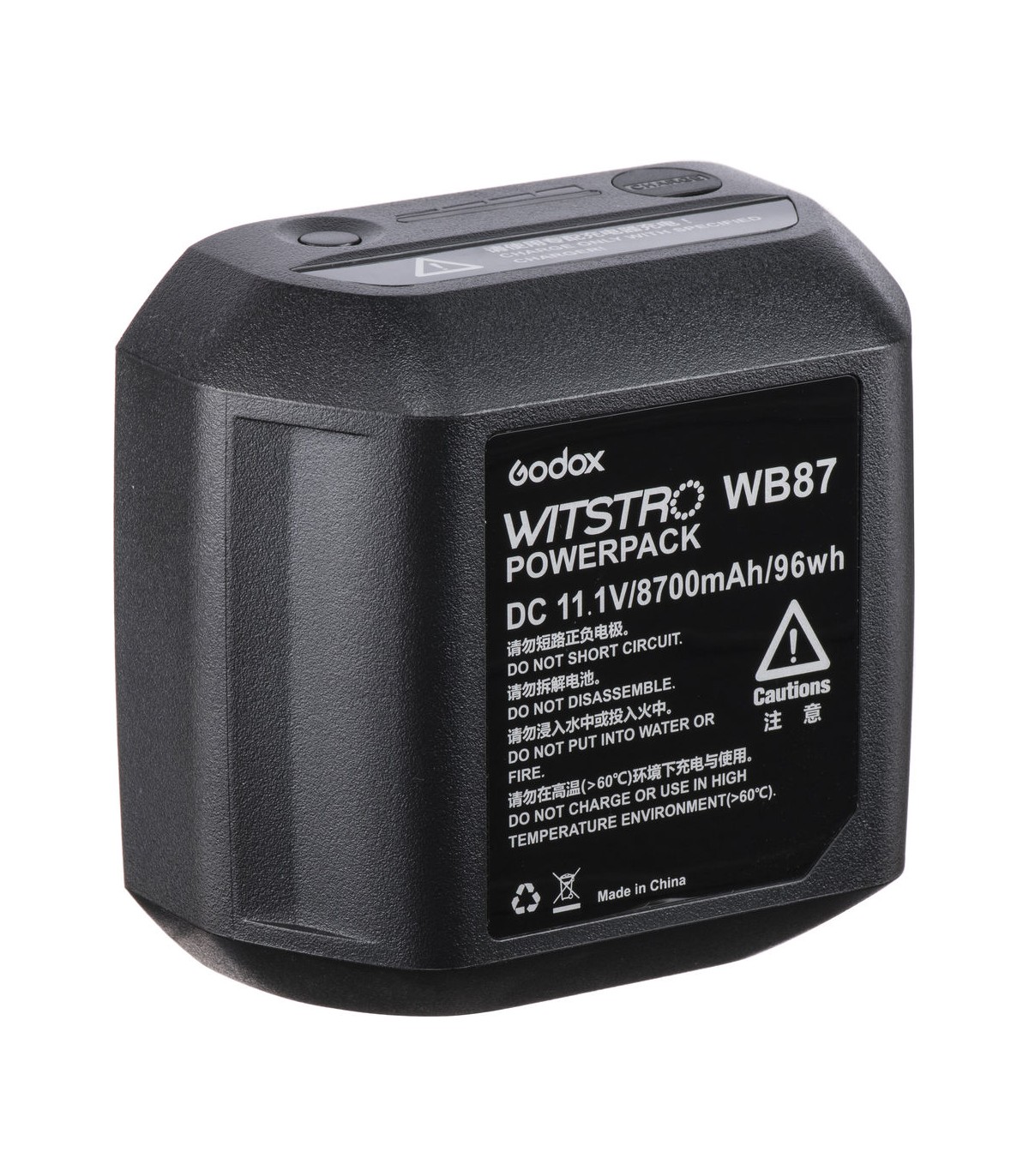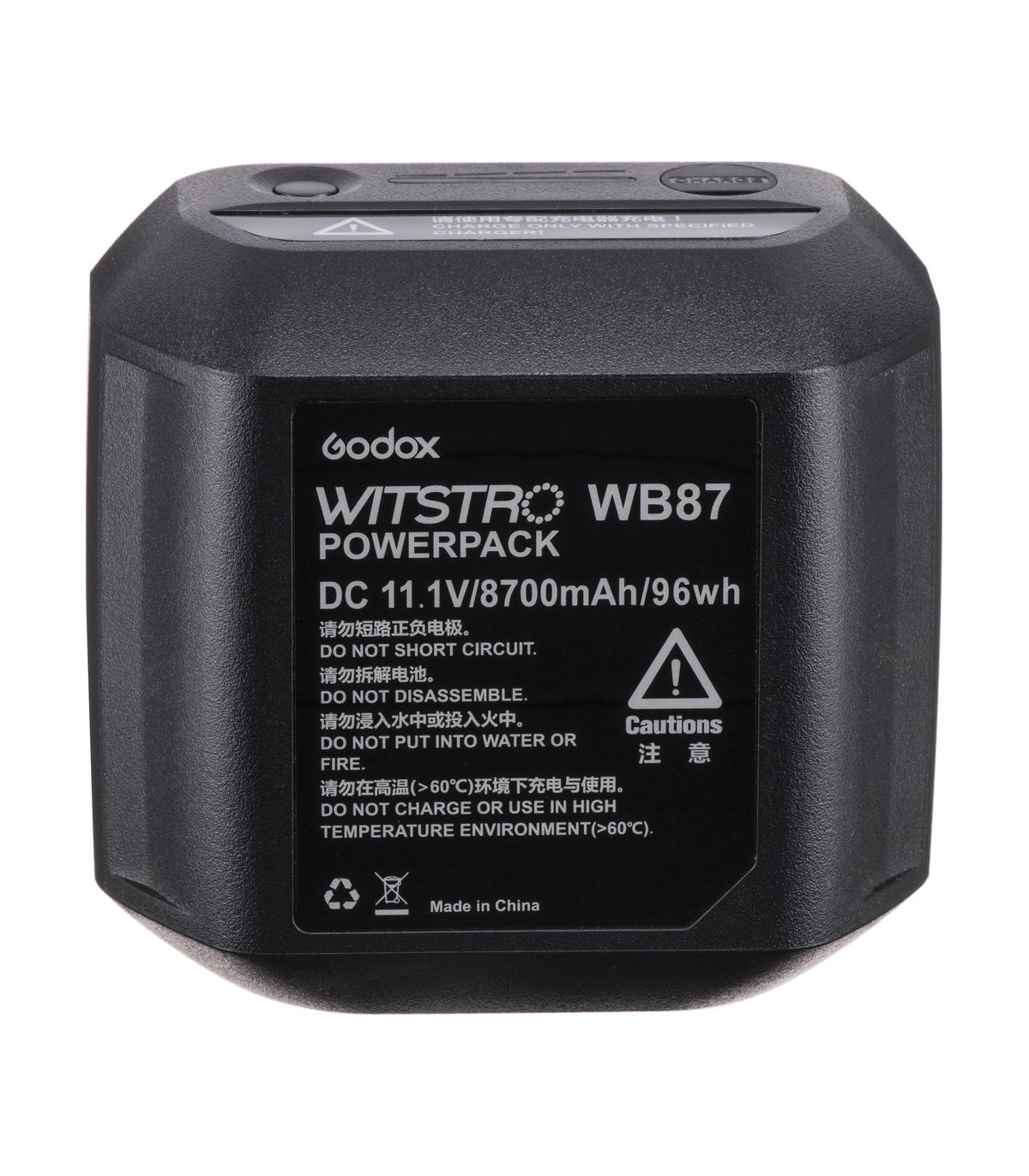 باتری فلاش پرتابل AD600B و AD600BM مدل godox WB-87 از نوع لیتیومی و با ظرفیت 8700mAh و ولتاژ 11.1V است که می تواند با هربار شارژ کامل تا 500 شات فلاش با بیشینه توان را پشتیبانی کند. این باتری با هد فلاش های گودکس سری AD600 سازگار است و از مدل های Godox Wistro AD600، AD600B، AD600M و AD600BM پشتیبانی می کند.