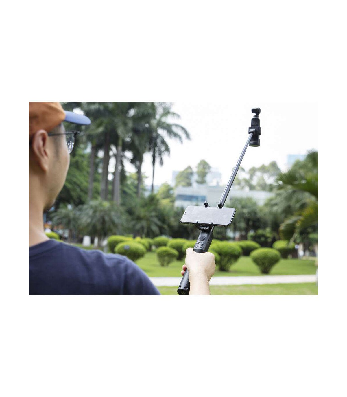 گیمبال Osmo Pocket یا Osmo Pocket 2 بدون نیاز به کابل و با مدارهای الکترونیکی منطبق بر هم به این مونوپاد متصل می شود و سپس می توان از جوی استیک و دکمه های تعبیه شده بر روی آن برای کنترل گیمبال استفاده کرد.