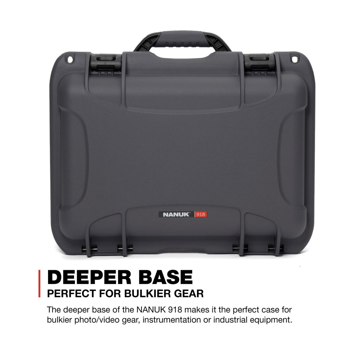 هارد کیس مقاوم در برابر نفوذ آب، گردوغبار و ضد خرد شدن نانوک مدل 918 از پلیپروپیلن رزین NK-7 ساخته شده است و میتوان از آن برای نگهداری و حمل تجهیزات کوچک مانند دوربین، هارد، دوربینهای شکاری، باتری، لنز، گوشی و یا تجهیزات صدابرداری استفاده کرد. این کیس دارای فوم چندلایه با حجم ۳۷.۸×۲۴.۹×۲۱.۸ سانتیمتر است که میتوان آن را برای قرار دادن لوازم مختلف برش داد. برای محافظت کامل از تجهیزات درب این کیس دارای فوم شانه تخممرغی و قسمت کف آن نیز دارای یک لایه محکم است.