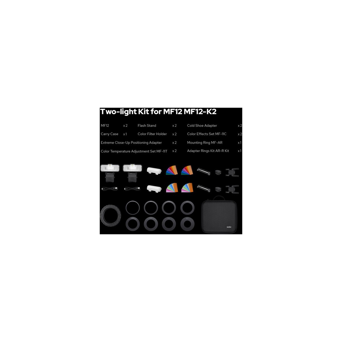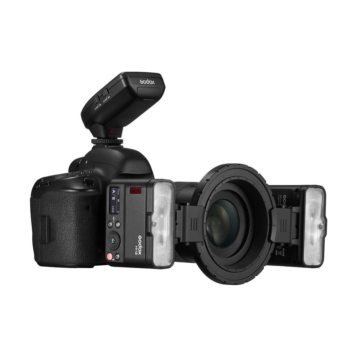 فلاش ماکرو MF12 گودکس دارای دو فلاش مجزا است که برای عکاسی کلوزآپ و ماکرو طراحی شده است. این فلاش به کاربر امکان عکاسی در فاصله بسیار نزدیک از سوژههای کوچک، مانند گیاهان، حیوانات و حشرات را با کیفیتی بالا فراهم میکند. این فلاش را کاربران میتوانند بر روی پایه مخصوص خود که همراه محصول ارائه میشود مانت و به راحتی تنظیم و استفاده کنند. برای کارایی بیشتر میتوان فلاش را با استفاده از مبدل مخصوص به دور لنز دوربین متصل کرد که این مبدل امکان اتصال همزمان تا ۶ فلاش MF12 را در اختیار کاربران گذاشته است. حلقه موجود در بسته بندی محصول امکان تنظیم زاویه فلاشها را به سمت لنز فراهم کرده است تا در هنگام عکاسی از فاصله بسیار نزدیک بتوان نور خوبی را به سوژه تاباند. برای استفاده از فلاش به صورت جدا و با فاصله از دوربین، این فلاش نیازمند یک فرستنده است که باید به صورت جداگانه خریداری شود. همچنین لازم به ذکر است که این فلاش با تریگرهای Godox Xpro، X1، X2 و سایر تریگرهایی که برای برندهای اصلی دوربینها مانند کانن، نیکون، سونی، فوجی، المپوس و پاناسونیک طراحی شدهاند نیز سازگار است.