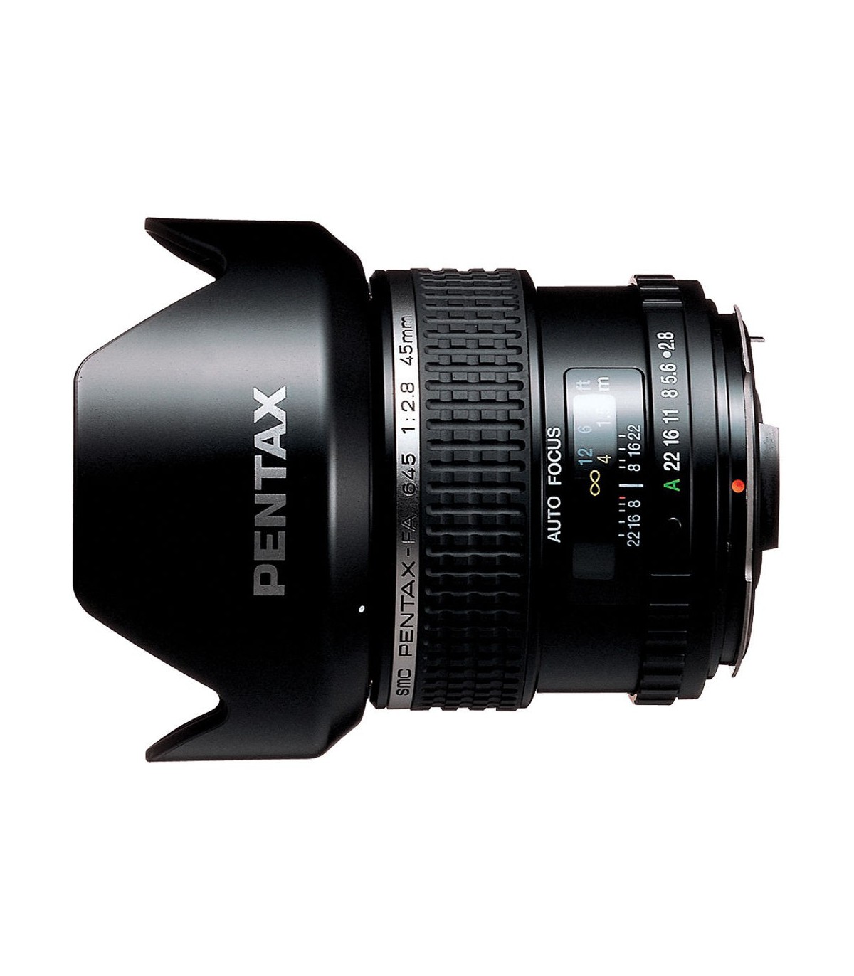 لنز پنتاکسsmc FA 45mm f/2.8 Lensبا فاصله کانونی ثابت 45mm در دوربینهای قطع متوسط، تقریبا برابر فاصله کانونی 35.5mm با زاویه دید برابر ۶۳ درجه در یک دوربین فرمت 35mm عادی است. این زاویه دید برای عکاسی خبری خیابانی، منظره و عکاسی پرتره جمعی بسیار مناسب است. حداکثر دیافراگم ثابت f/2.8 در این لنز تصویری فوقالعاده روشن و شفاف در منظرهیاب را نمایش داده و به شما امکان میدهد بدون نیاز به کاهش یرعت شاتر و بدون افزایش حساسیت دوربین، به راحتی در نور کم عکسبرداری کنید. این گشودگی دیافراگم با ۸ تیغه، در کنار یک حسگر قطع متوسط، پس زمینهای بسیار محو با بوکهای فوقالعاده را برای عکس های پرتره و خبری فراهم میکند. دیافراگم این لنز تا f/22 کاهش مییابد. همچنین به منظور جلوگیری از بازتاب نورهای اضافی در داخل لنز، یک هود نیز همراه با این لنز ارائه میشود.