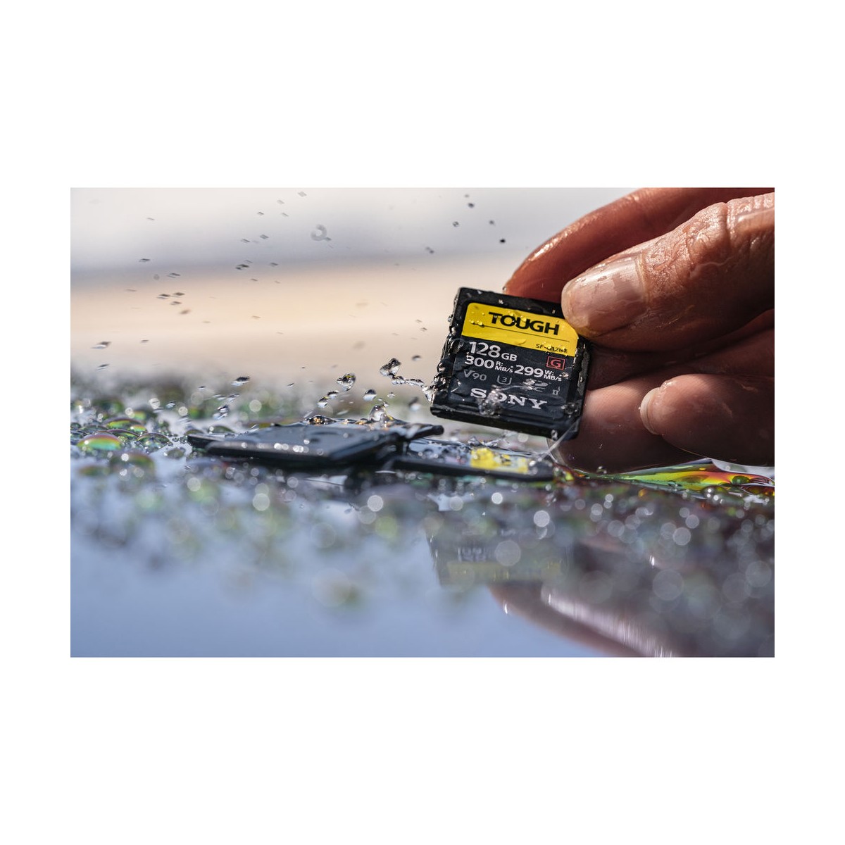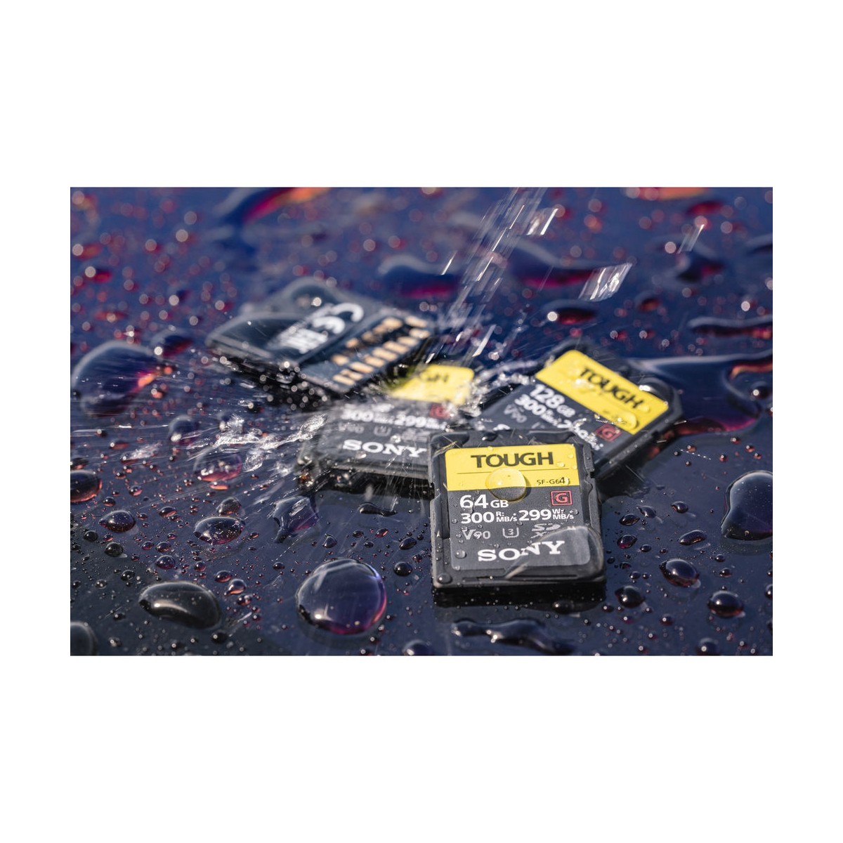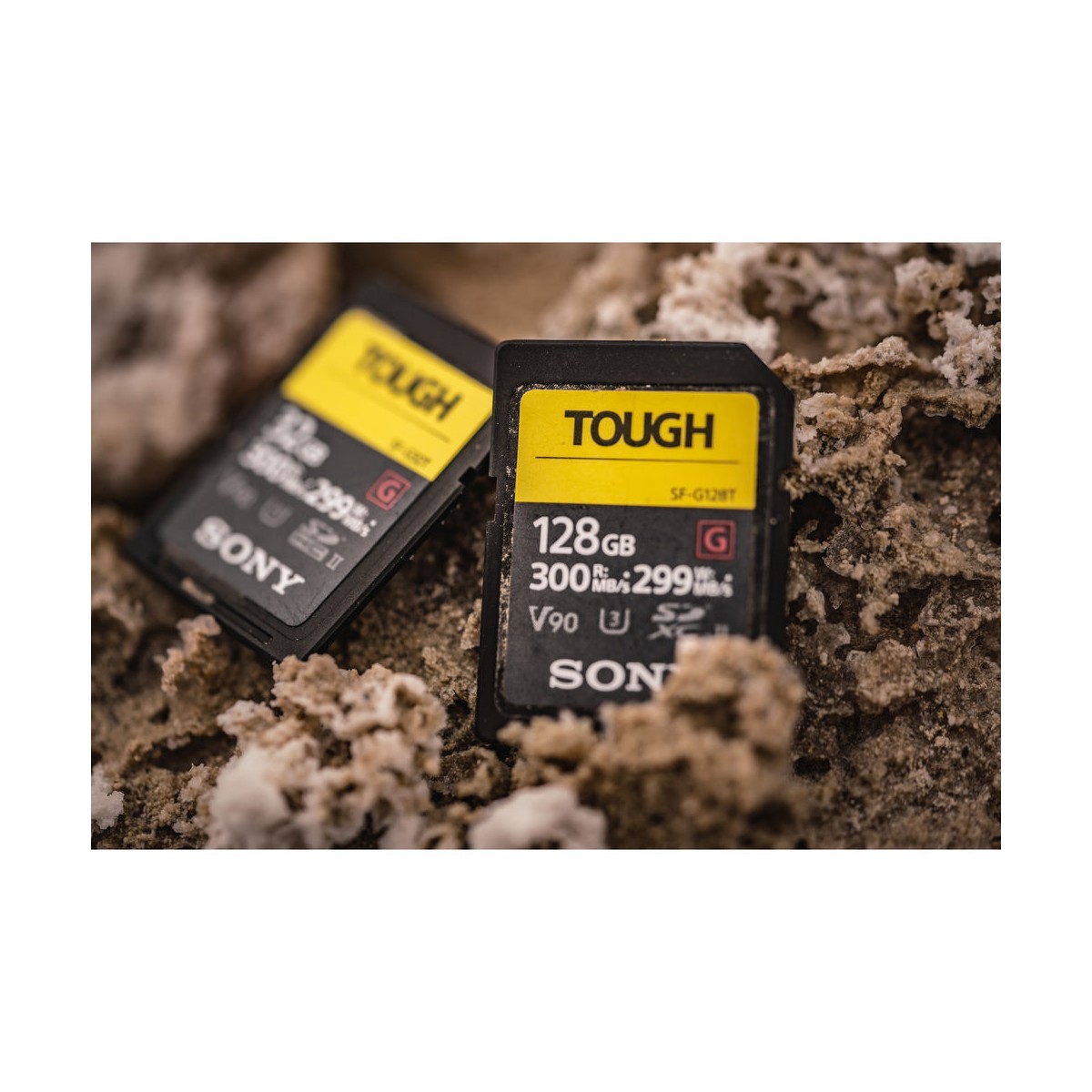 کارت حافظه 128GB SF-G Tough Series UHS-II سونی دارای ظرفیت ۱۲۸ گیگابایتی و استاندارد UHS-II است. این مموری کارت از قابلیتهای پیشرفته دوربینهای DSLR بالا رده مانند عکاسی پیدرپی با سرعت بسیار بالا، عکسبرداری در فرمتهای RAW و JPEG، فیلمبرداری با رزولوشن 8K، 4K XAVC S، 60p AVCHD، 3D و فیلمبرداری Full HD پشتیبانی میکند. حداکثر سرعت خوانش اطلاعات در این کارت حافظه برابر با ۳۰۰ مگابایت بر ثانیه و حداکثر سرعت ثبت اطلاعات آن نیز برابر با ۲۹۹ مگابایت بر ثانیه است. به لطف وجود استاندارد V90 در این کارت حافظه، حداقل سرعت ثبت اطلاعات با ۹۰ مگابایت در ثانیه در تمام شرایط تضمینشده است.