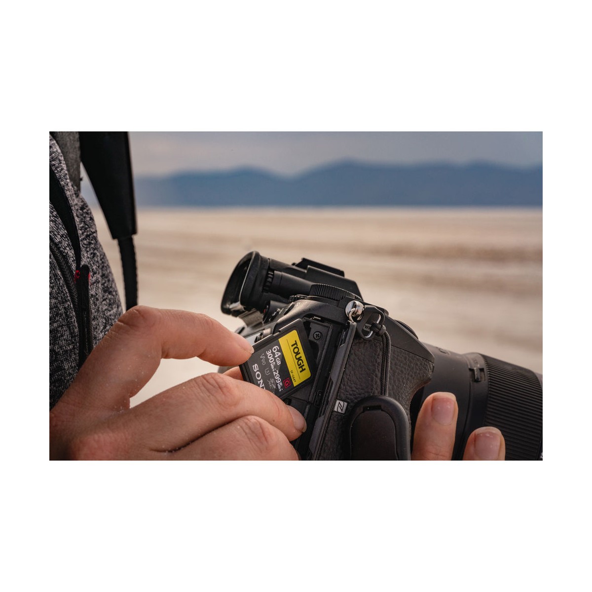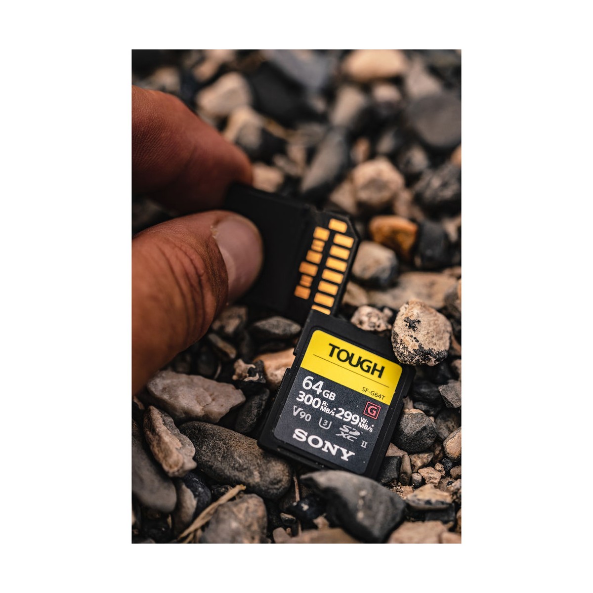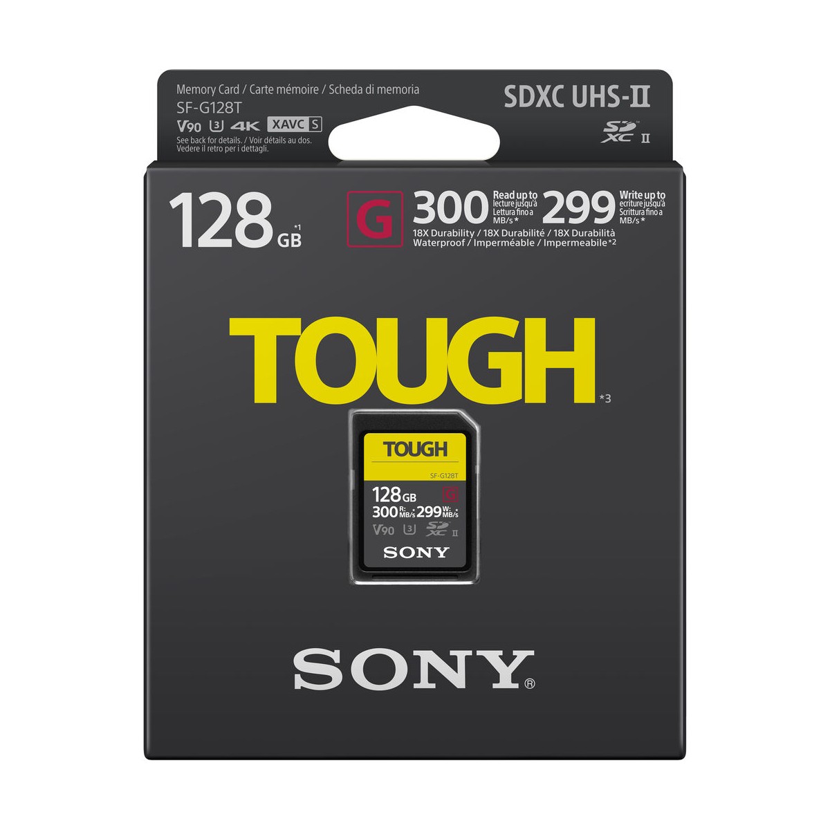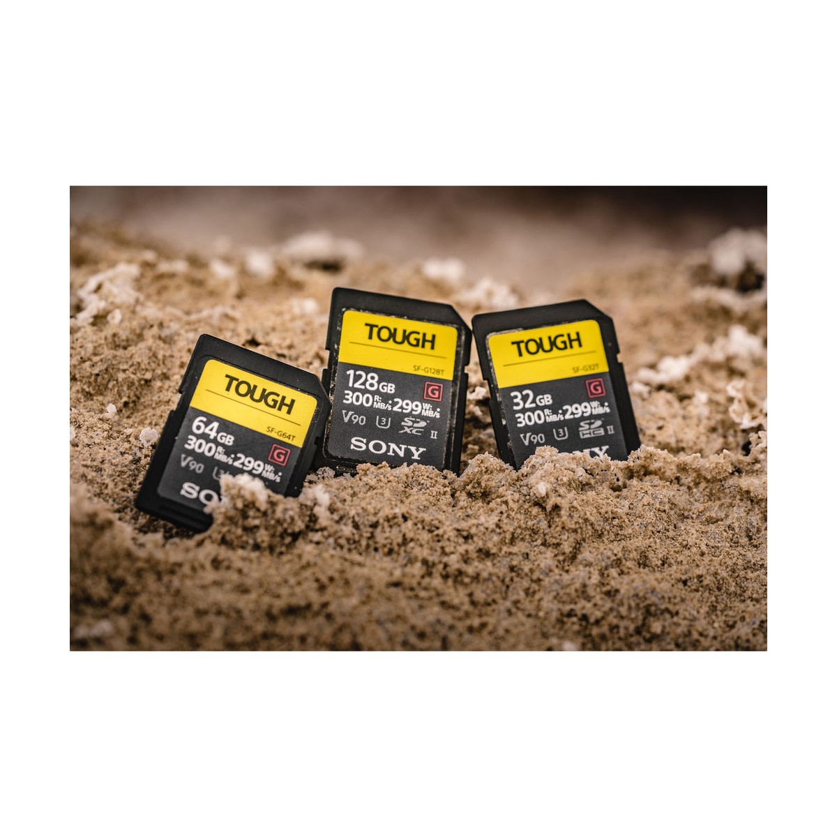 کارت حافظه 128GB SF-G Tough Series UHS-II سونی دارای ظرفیت ۱۲۸ گیگابایتی و استاندارد UHS-II است. این مموری کارت از قابلیتهای پیشرفته دوربینهای DSLR بالا رده مانند عکاسی پیدرپی با سرعت بسیار بالا، عکسبرداری در فرمتهای RAW و JPEG، فیلمبرداری با رزولوشن 8K، 4K XAVC S، 60p AVCHD، 3D و فیلمبرداری Full HD پشتیبانی میکند. حداکثر سرعت خوانش اطلاعات در این کارت حافظه برابر با ۳۰۰ مگابایت بر ثانیه و حداکثر سرعت ثبت اطلاعات آن نیز برابر با ۲۹۹ مگابایت بر ثانیه است. به لطف وجود استاندارد V90 در این کارت حافظه، حداقل سرعت ثبت اطلاعات با ۹۰ مگابایت در ثانیه در تمام شرایط تضمینشده است.