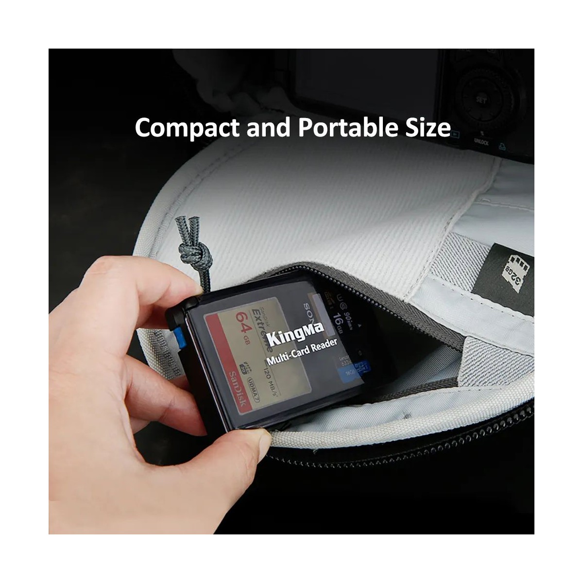 کینگما All-in-1 امکان اتصال همزمان چند کارت حافظه را دارد. این ویژگی، زمانی که نیاز به جابهجایی اطلاعات بین چندین کارت حافظه دارید، بسیار مفید خواهد بود. بهجای تعویض مداوم کارتها، میتوانید تمامی آنها را بهصورت همزمان به دستگاه متصل کرده و از سهولت کار لذت ببرید.