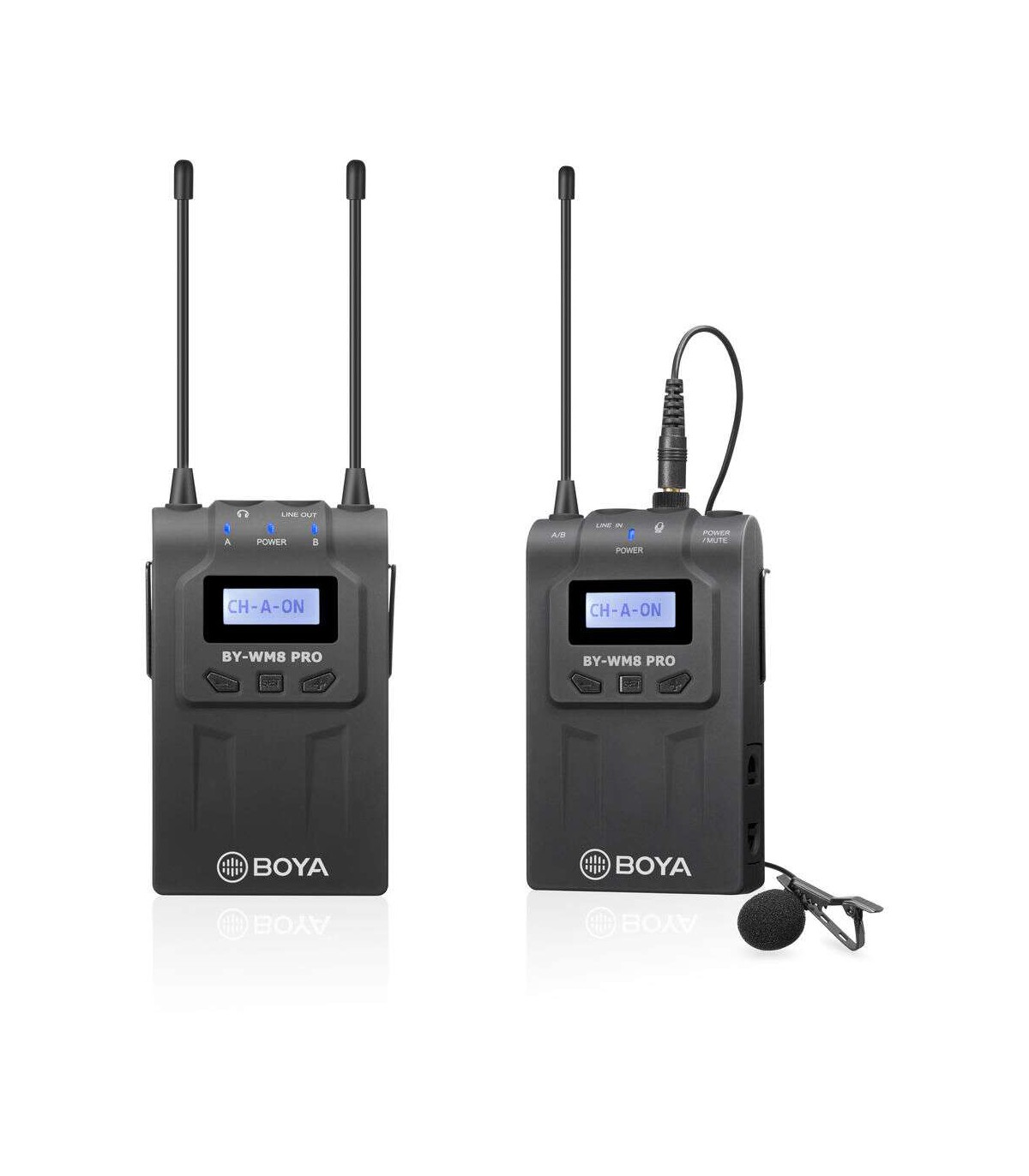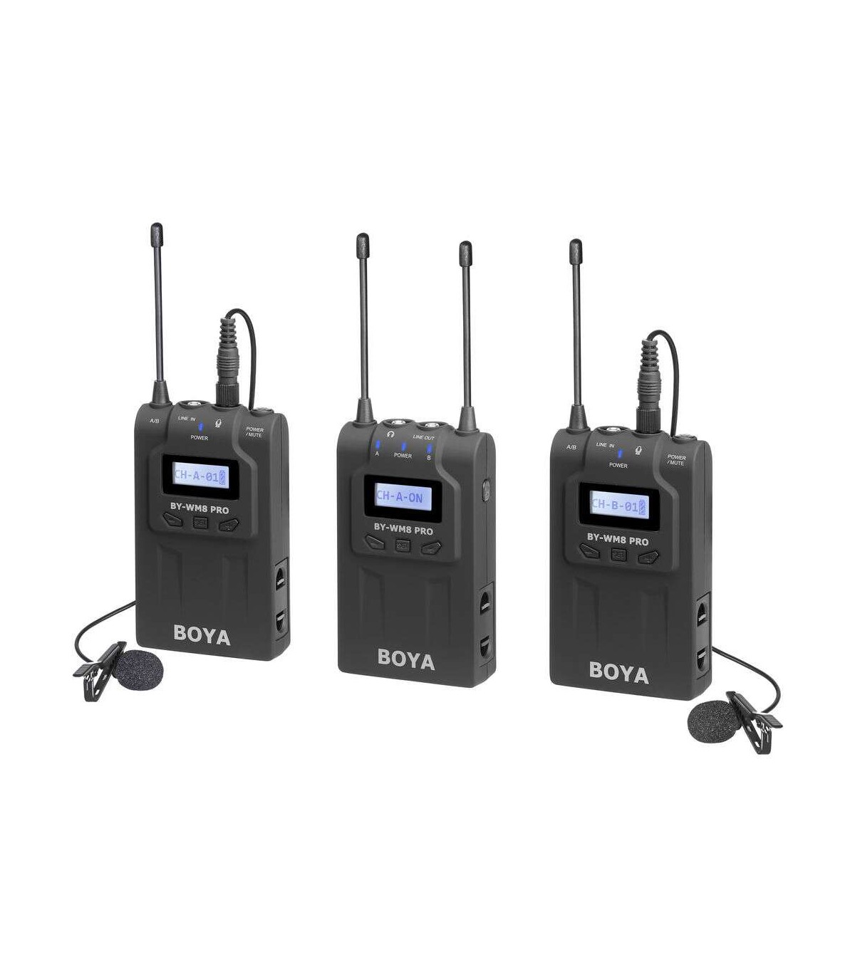 بویا BY-WM8 Pro-K2 یک میکروفون بیسیم دوکاناله و از نوع لاوالیر است که درواقع یک کیت صدابرداری میباشد. این محصول شامل یک عدد گیرنده ۲ کاناله وایرلس و دو عدد فرستنده بیسیم بادی پک میباشد. همراه هرکدام از فرستندهها یک میکروفون با الگوی قطبی Omnidirectional نیز عرضه شده است. این میکروفنها دارای کلیپس برای اتصال به لباس بوده و برای هرکدام نیز یک فوم بادگیر در نظر گرفتهشده است. علاوه بر موارد فوق، در این کیت یک مانت کفشک برای اتصال گیرنده به دوربین، کابل خروجی ۱/۸ به XLR، کابل خروجی ۱/۸ به ۱/۸ و یک کیف حمل نیز وجود دارد.