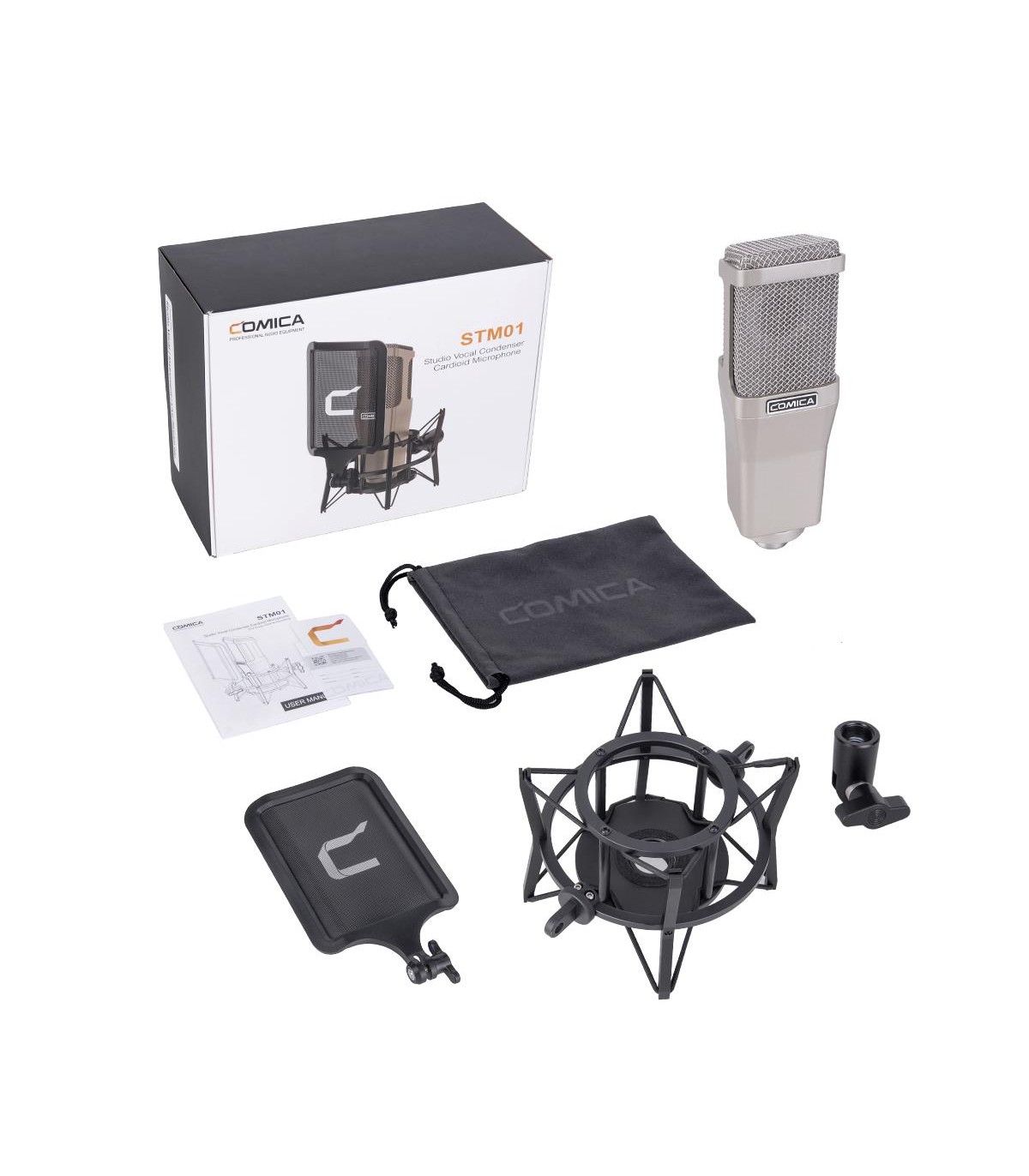 میکروفون وکال استودیویی کامیکا Comica STM01 یک میکروفون کاندنسر کاردیوید با قطر بزرگ دیافراگم (34 میلی متر) است. این میکروفون سطح نویز 5 db-A دارد که آن را به عنوان میکروفون ضبط صدای افراد به یک انتخاب عالی تبدیل می کند. البته ضبط صدای گیتار و پرکاشن نیز با دقت و جزئیات انجام می شود. با استفاده از این میکروفون می توان تمامی جزئیات قابل شنیدن در یک محیط آکوستیک را ضبط کرد؛ حتی اگر صدای اجرای شلوغ و پرهیجان راک اند رول باشد. پاپ شیلد این محصول از نوع استودیویی است و یک مانت ضد لرزش نیز به همراه آن ارائه شده است.