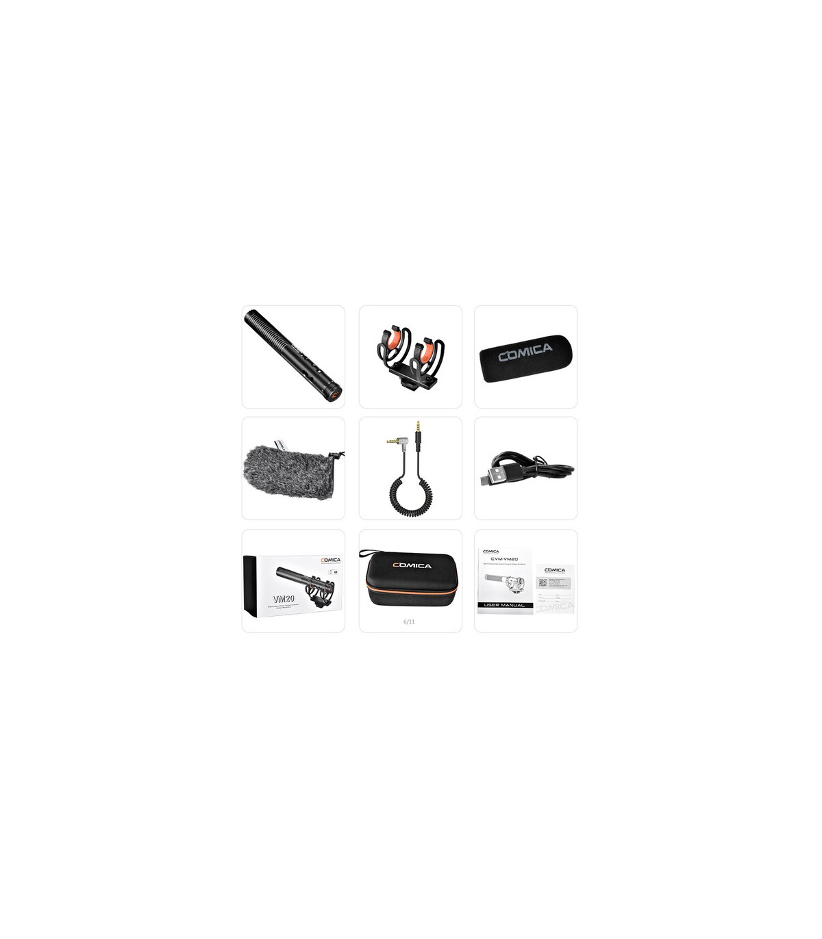 به همراه این محصول یک شاک مانت نیز ارائه شده که در قسمت شو مانت دوربین نصب می شود تا لرزش های ناشی از حرکت یا کار با دوربین سبب ایجاد نویز در صدای ضبط شده نشود. بادگیر نیز برای کاهش نویز های ناشی از باد یا تهویه مطبوع می شود. برای پیشگیری از نویز بادهای شدید باید بادگیر از نوع Furry Windshield به صورت جداگانه تهیه شود. میکروفون شاتگان کامیکا Comica CVM-VM20 به همراه یک کیس حمل و نقل عرضه شده تا جابجایی آن آسان، ایمن و بی دردسر باشد.