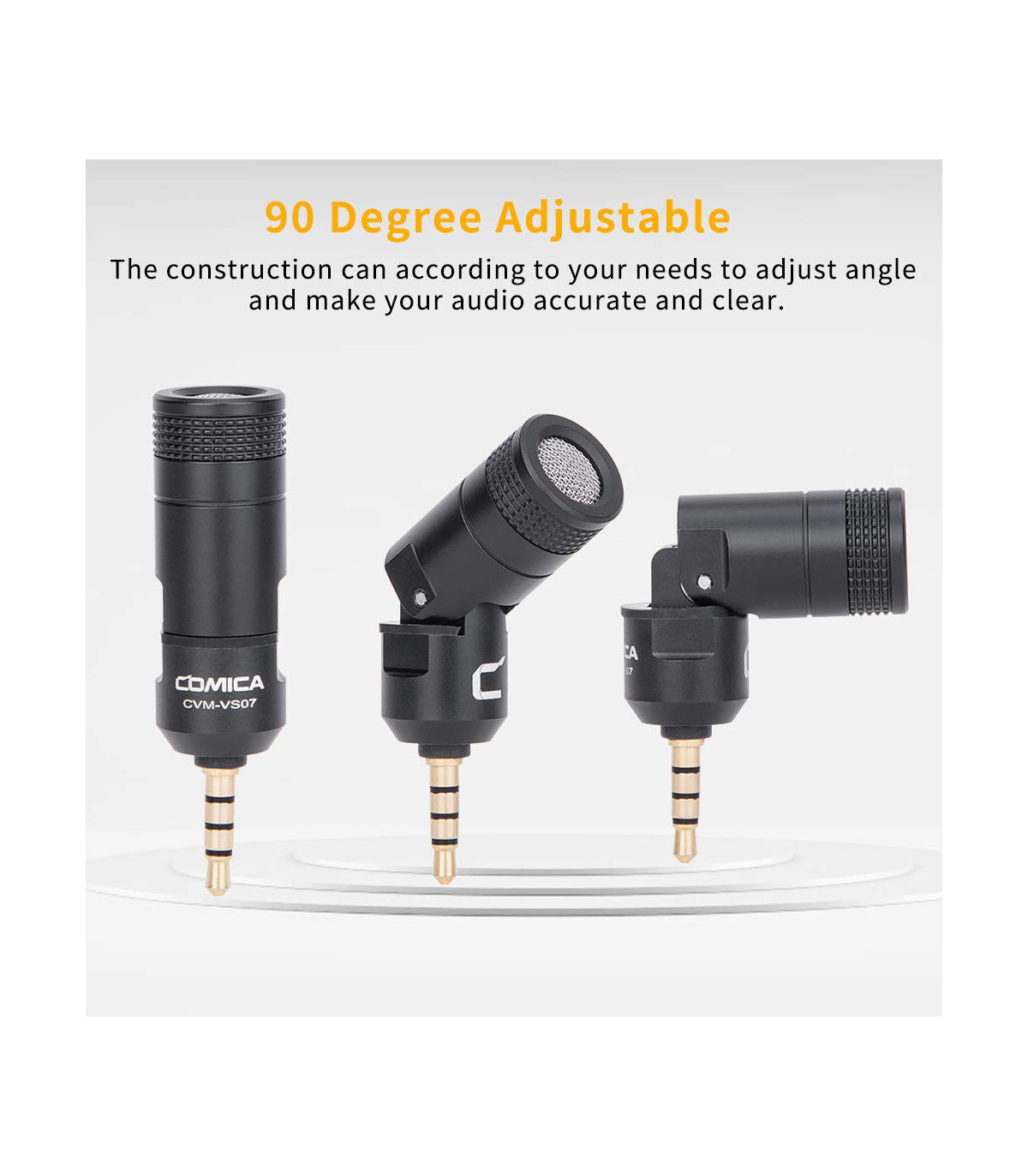 کپسول میکروفون موبایل کامیکا Comica CVM-VS07C روکشی از جنس طلا دارد و با الگوی قطبی کاردیوید، تنها صداهایی که منبع آن ها در جلوی میکروفون قرار گرفته باشد را ضبط می کند. در نتیجه انواع صداهایی که از اطراف شنیده می شوند در فایل ضبط شده وجود نخواهند داشت. این دقیقا بر عکس میکروفون های تمام جهته داخلی دوربین ها و موبایل ها است. مانت این میکروفون قابلیت چرخش 90 درجه ای دارد تا تنظیم صحیح آن نسبت به منبع صدا آسان باشد.