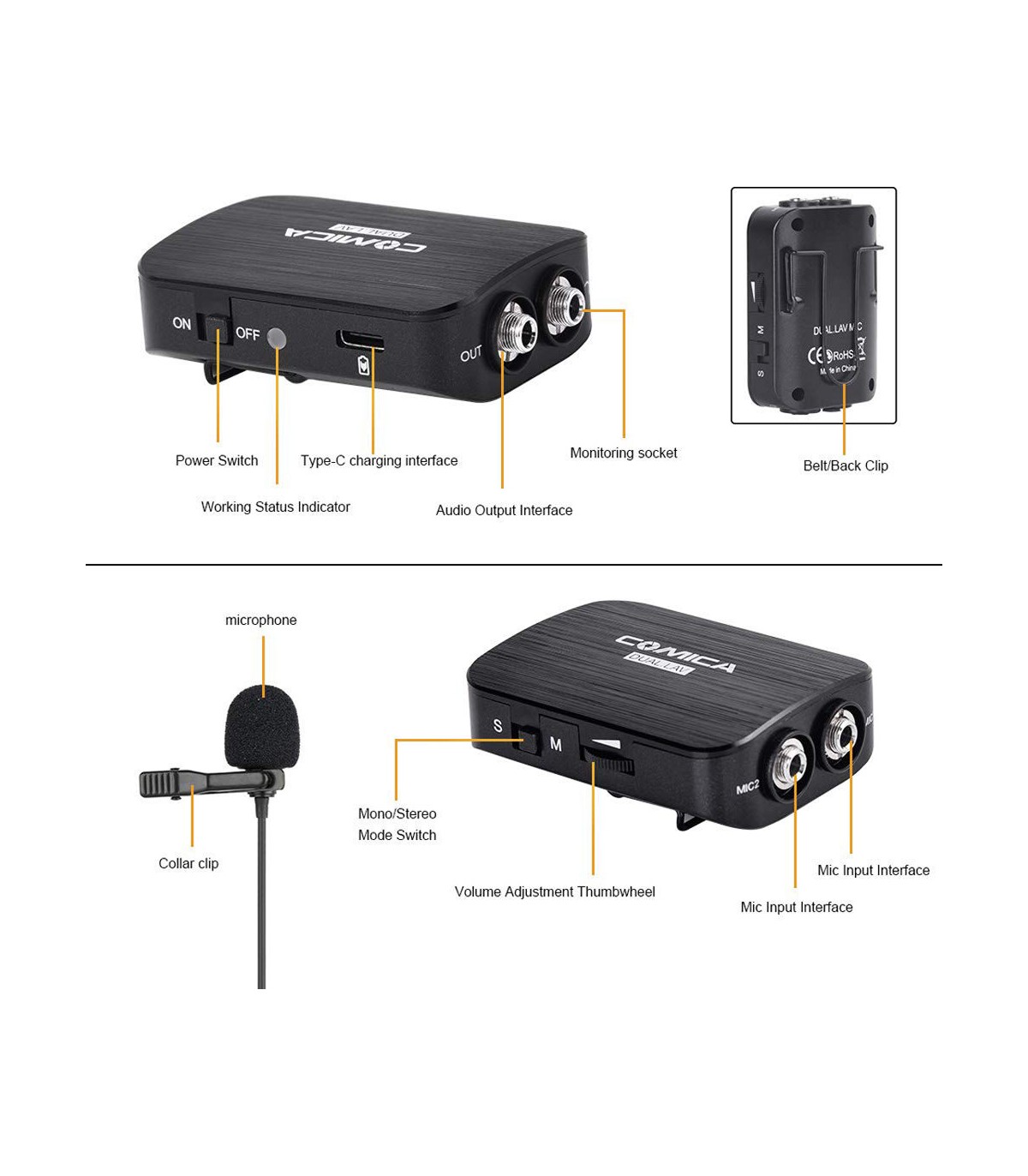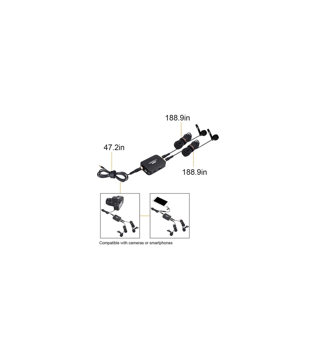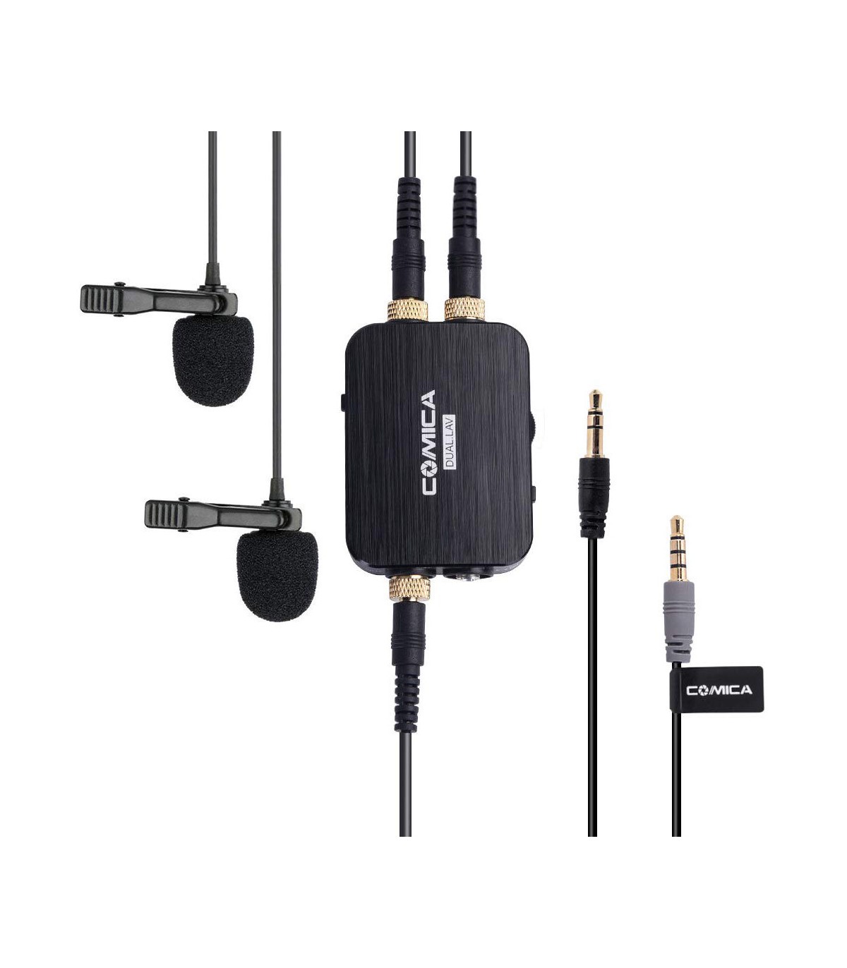 میکروفون یقه ای دوبل کامیکا Comica DUAL.LAV D03 راه حلی اقتصادی برای خبرنگاران، تولید کنندگان پادکست و مستند سازان است که توانایی ضبط صدای دو نفر را به صورت همزمان دارد. این مجموعه شامل دو عدد میکروفون یقه ای است که با یک اتصال تکی به ورودی دوربین بدون آیینه، DSLR، موبایل یا رکوردر متصل می شود و امکان مانیتورینگ مستقیم را نیز فراهم می کند. اتصال این میکروفون از طریق جک 3.5 میلی متری انجام می شود.