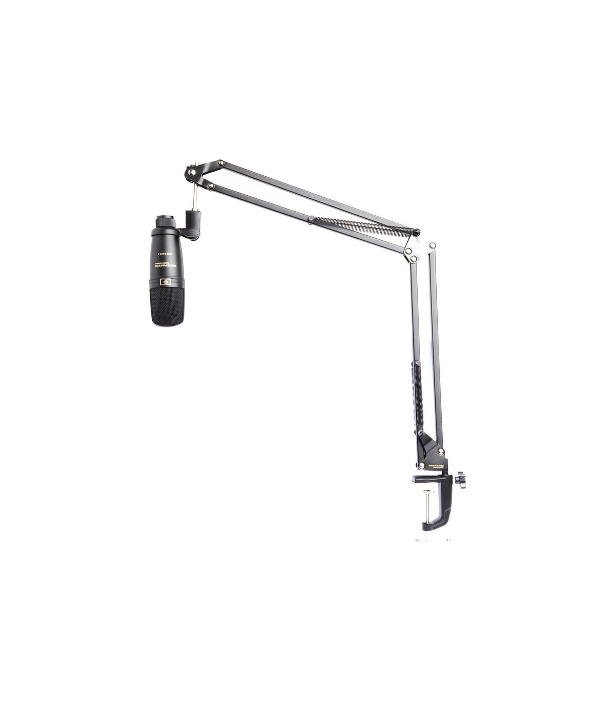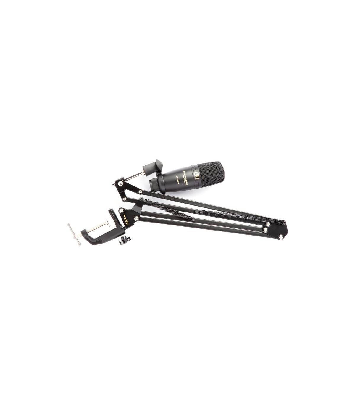 این محصول برخلاف بسیاری از میکروفونهای خانگی که به یک استند رومیزی مجهز هستند، به همراه یک بوم قابل تنظیم میکروفون عرضه شده است. این بوم به راحتی به لبه میز متصل شده و با نگهداشتن میکروفون در بهترین وضعیت، ظاهری حرفهای به کار شما میبخشد. یک گیره میکروفون و یک کابل USB نیز در بستهبندی این محصول وجود دارد.