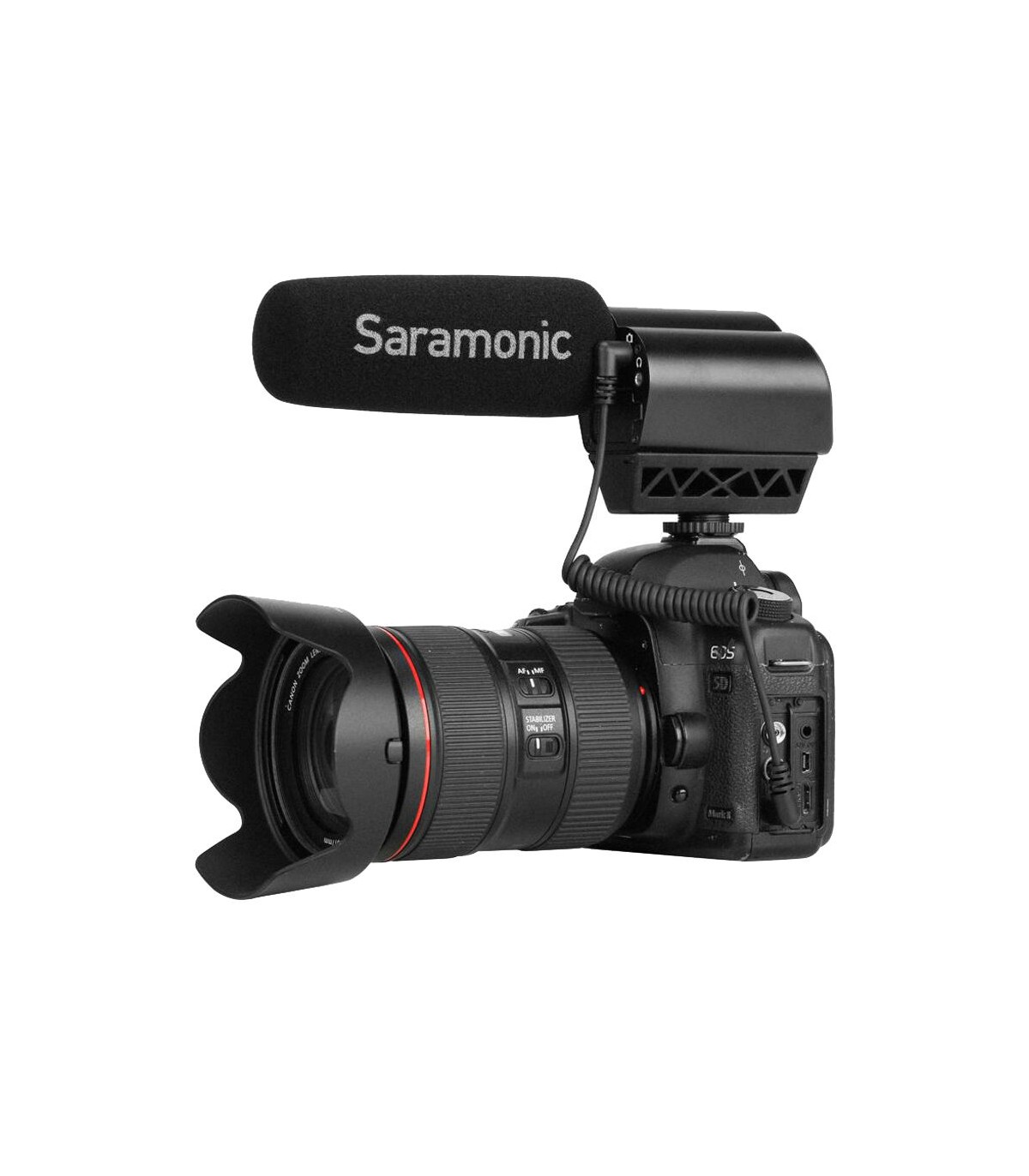 به لطف وجود یک خروجی هدفون بر روی میکروفون شات گان رودوربینی Saramonic مدل Vmic Mark II، امکان شنیدن صدای دریافت شده توسط میکروفون مهیا شده است و دیگر نیازی به اتصال هدفون به دوربین نیست. برای اتصال خود میکروفون به دوربین نیز میتوان از کابل تلفنی کوتاهی که به همراه آن ارائه شده است استفاده کرد تا طول بلند سیمها دردسرساز نشود. این کابل قابل جدا شدن است و میتوان از هر کابل ۳.۵ میلیمتری TRS دیگری به جای آن استفاده کرد. برای مثال به هنگام استفاده از بوم میکروفون از کابلهای بلندتر استفاده کرد یا برای اتصال این محصول به موبایلهای iOS و اندروید از مبدلهای مربوطه بهره گرفت.