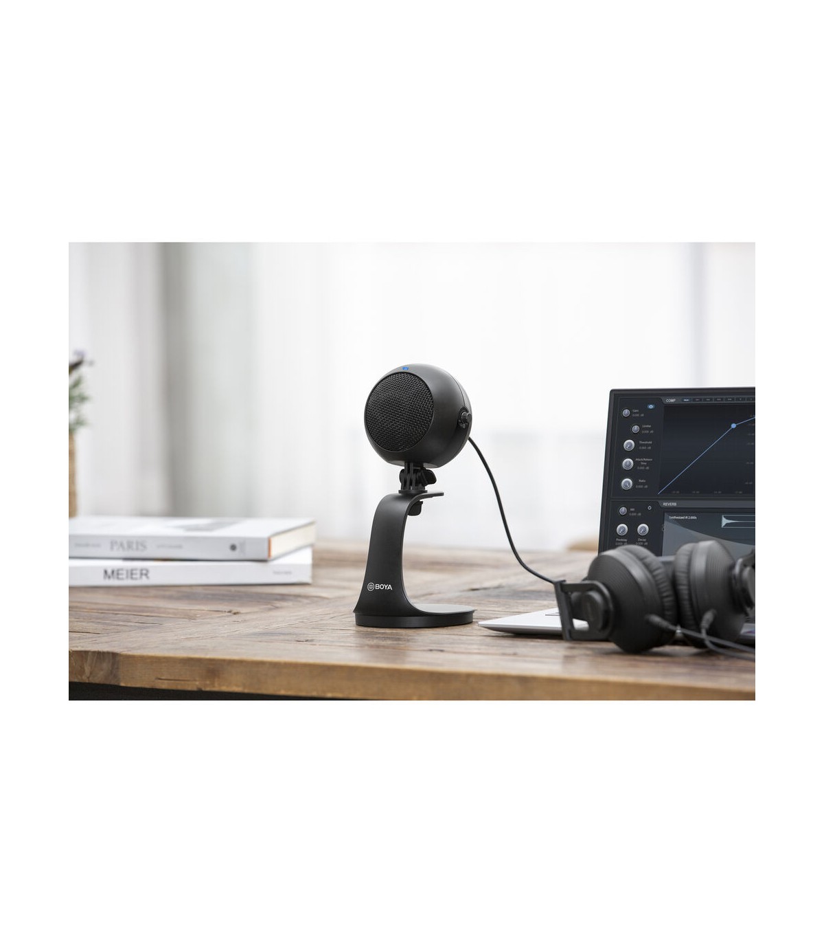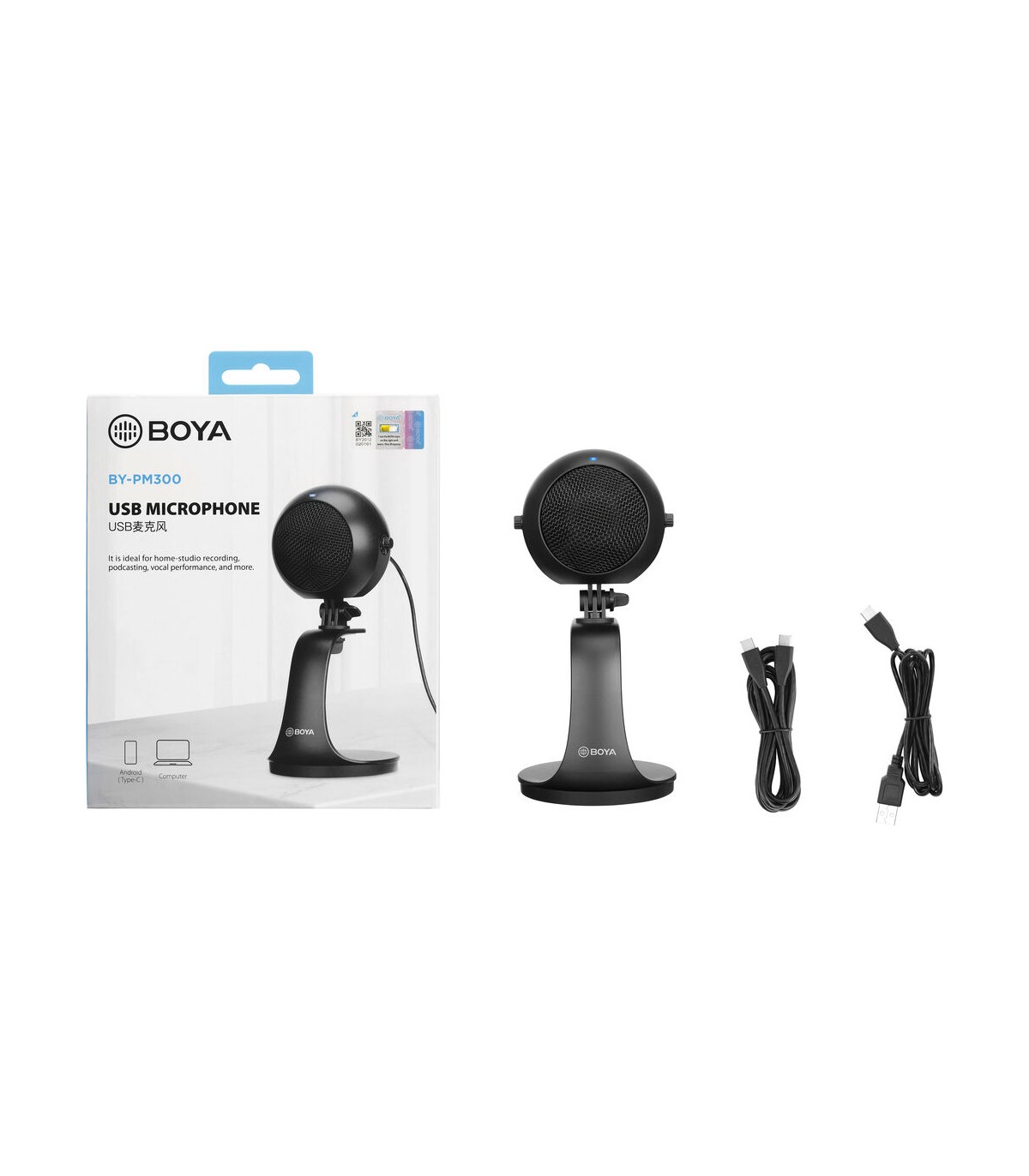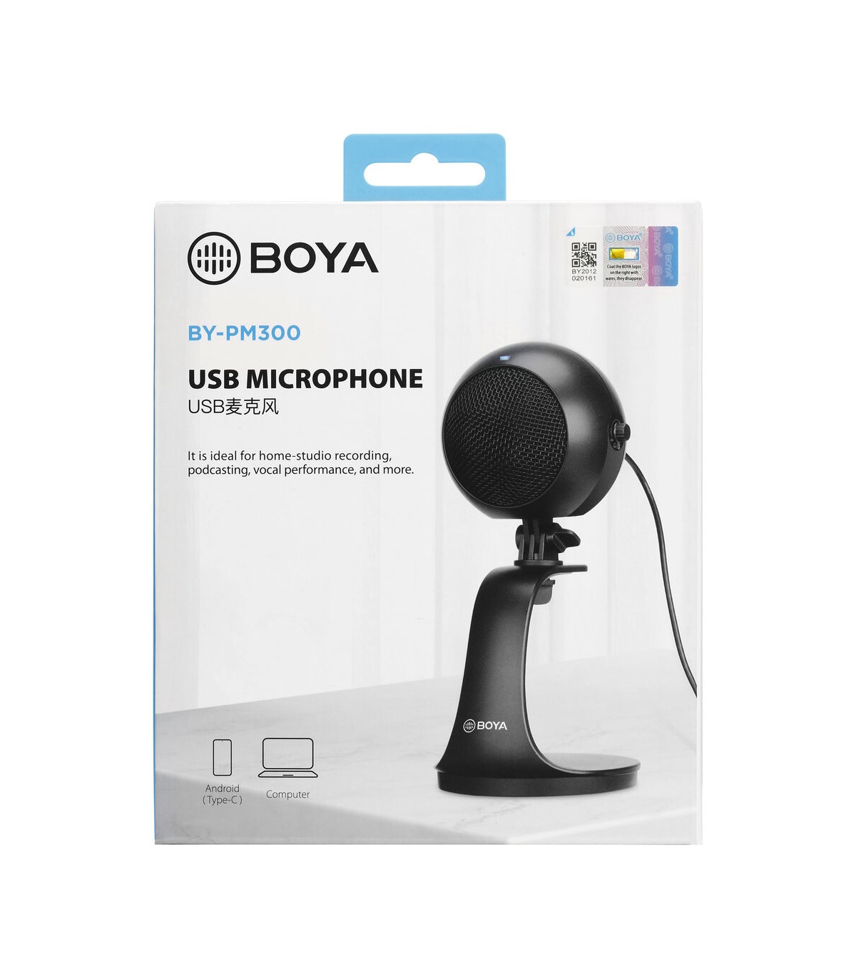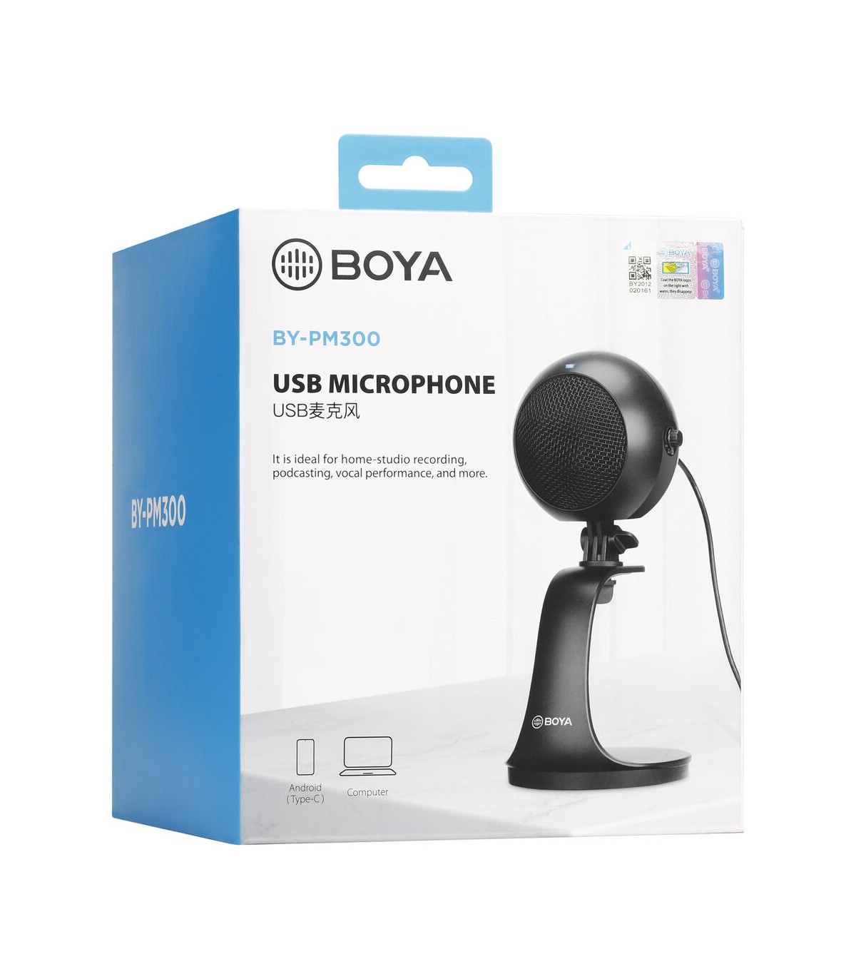 میکروفون رومیزی بویا مدل Boya BY-PM300 یک میکروفون USB و سازگار با بیشتر گوشیهای هوشمند اندروید، کامپیوترهای ویندوزی و مک است. این محصول با بهرهگیری از الگوی قطبی کاردیوید صدا را به صورت متمرکز تنها از قسمت جلویی میکروفون دریافت میکند و از ضبط نویزهای ناخواسته پسزمینه پیشگیری میکند. به این ترتیب استفاده از آن برای استودیوهای خانگی، ضبط پادکست، آواز خواندن و غیره مناسب است.