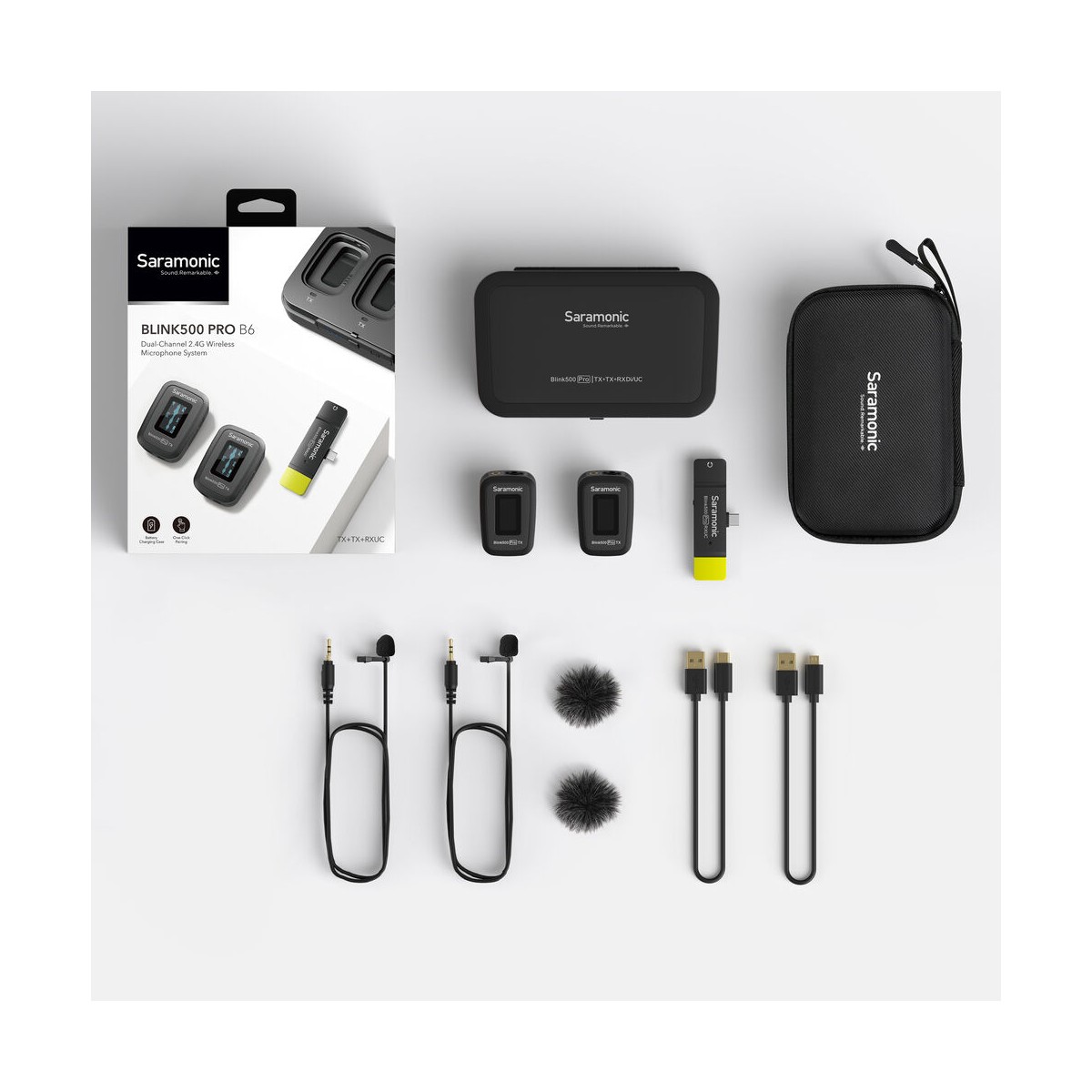 میکروفون سارامونیک Blink 500 Pro B6 میکروفونی کاملا کامپکت است که کنترل و استفاده از آن نیز به سادگی ورژن اولیه Blink 500 است. این میکروفون دارای یک نمایشگر باکیفیت، خروجی در حالتهای مونو و استریو، ۶۰ درصد دوام باتری بیشتر و برد دو برابر است. این میکروفون برای تولید کنندگان محتوا، فیلمبرداران، و خبرنگارانی که دارای دستگاههای مجهز به پورت USB Type-C هستند، مناسب است.