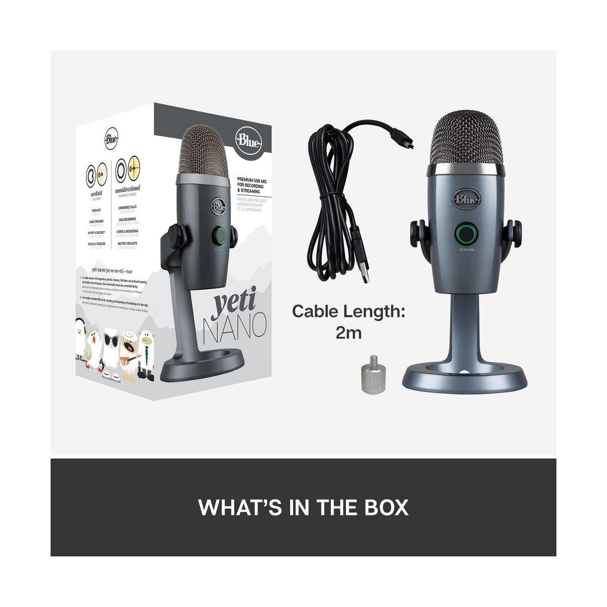 میکروفون Blue مدل YETI Nano یک میکروفون کاندنسر با قابلیت تغییر الگوی قطبی است که میتواند خروجی باکیفیتی برای تولیدکنندگان محتوا، ضبط پادکست، استریم آنلاین و استودیوهای موسیقی خانگی در اختیار بگذارد. بهمحض باز کردن بستهبندی این میکروفون و اتصال آن به کامپیوتر و یا دستگاههای iOS میتوان به استفاده از آن پرداخت.