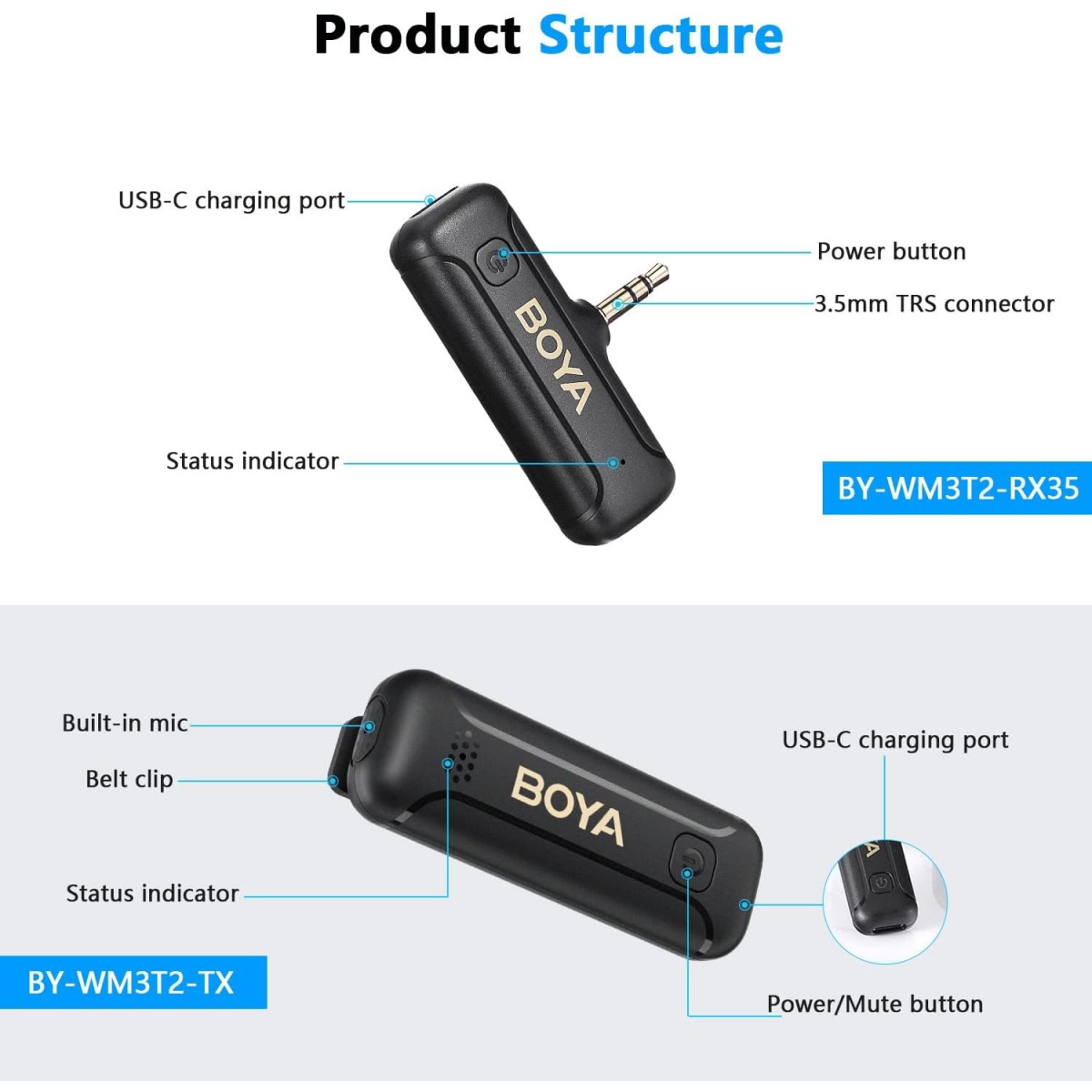 میکروفون بیسیم BY-WM3T2-M2 بویا از امواج بیسیم ۲.۴ گیگاهرتزی پشتیبانی میکند. این میکروفون میتواند صدای بسیار باکیفیتی را در اجراهای زنده اینترنتی، ولاگ، ضبط ویدیوهای آموزشی و سایر موقعیتها در اختیار بگذارد. این میکروفون دارای پورت ۳.۵ میلیمتری TRS است که با اکثر گوشیهای و دوربینها سازگاری دارد. این میکروفون همراه با دو فرستنده عرضه شده است که بهواسطه این موضوع میتوان بهصورت همزمان صدای دو منبع صوتی را ضبط کرد.