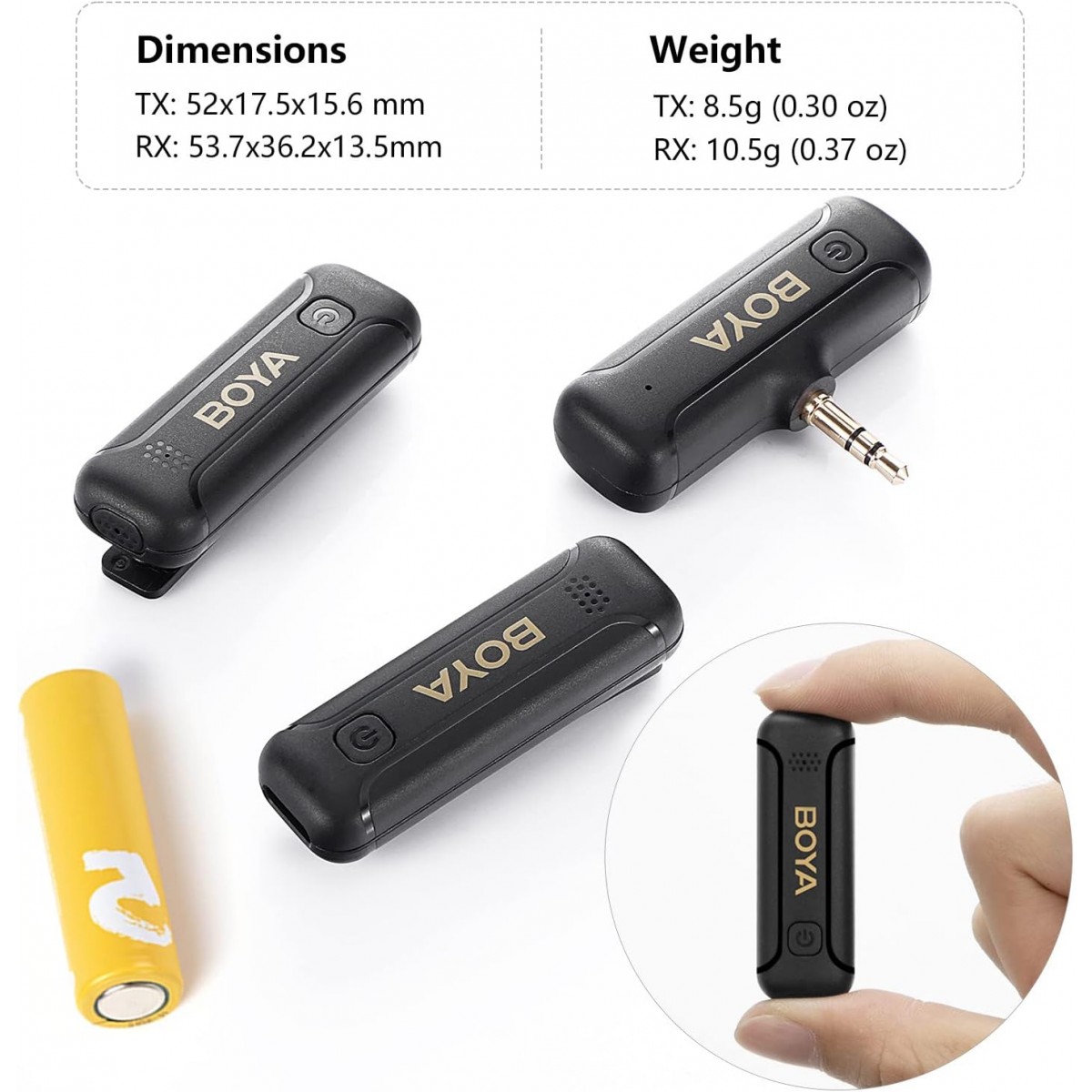 میکروفون بیسیم BY-WM3T2-M2 بویا بسیار سبک و کوچک است. وزن گیرنده و فرستنده این میکروفون رویهم کمتر از ۱۵ گرم است. بهموجب وزن بسیار سبک این میکروفون در هنگام نصب آن بر روی لباس، فرستنده از جای خود تکان نخواهد خورد.