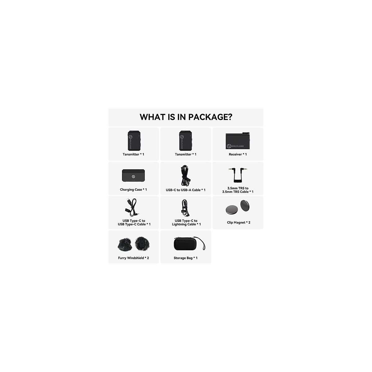 | محتویات جعبه | دو فرستنده، گیرنده، کیس شارژ، کابل USB-C (تایپ سی) به USB-A، کابل USB-C به USB-C، کابل USB-C به Lightning، کابل 3.5 میلیمتری TRS به TRS، دو خز بادگیر، دو گیره مغناطیسی، کیف حمل و دفترچه راهنما |