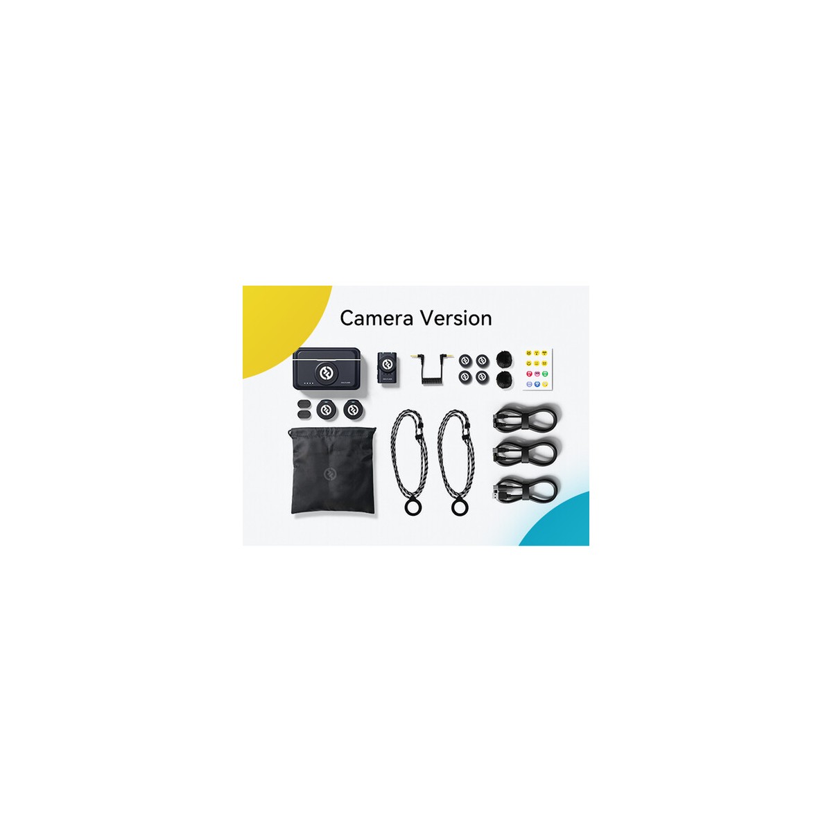 | محتویات جعبه | دو فرستنده، یک گیرنده قابل نصب روی دوربین، یک جعبه شارژ نسخه دوربین، کابلها، دو خز بادگیر، دو گیره پشتی، چهار گیره مغناطیسی، دو گردنبند سیلیکونی، یک پک استیکر، دفترچه راهنما و یک کیسه |