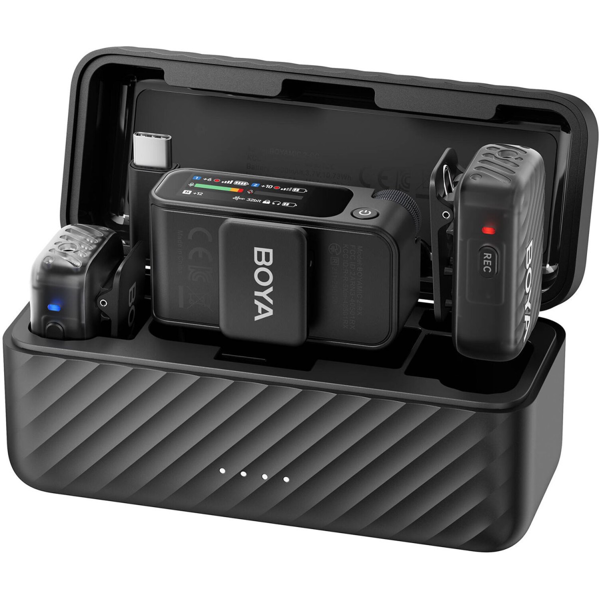 یکی از برجستهترین ویژگیهای BOYAMIC 2، توانایی ضبط داخلی آن است. هر فرستنده دارای ۸ گیگابایت حافظهی داخلی است که امکان ضبط بیش از ۱۵ ساعت صدا با کیفیت ۲۴ بیت را فراهم میکند. در حالت ضبط داخلی، سیستم از فناوری ۳۲-bit float بهره میبرد که تغییرات ناگهانی حجم صدا را بدون قطع یا اعوجاج ثبت میکند؛ حتی اگر منبع صدا بسیار نزدیک یا بلند باشد. ویژگی Auto File Splitting بهصورت خودکار فایلهای طولانی را به بخشهای قابلمدیریت تقسیم میکند، و از طریق پورت USB-C میتوانید آنها را مستقیماً به رایانه یا موبایل منتقل کنید. بهعبارت ساده، BOYAMIC 2 یک رکوردر مستقل در اندازهی کف دست است.