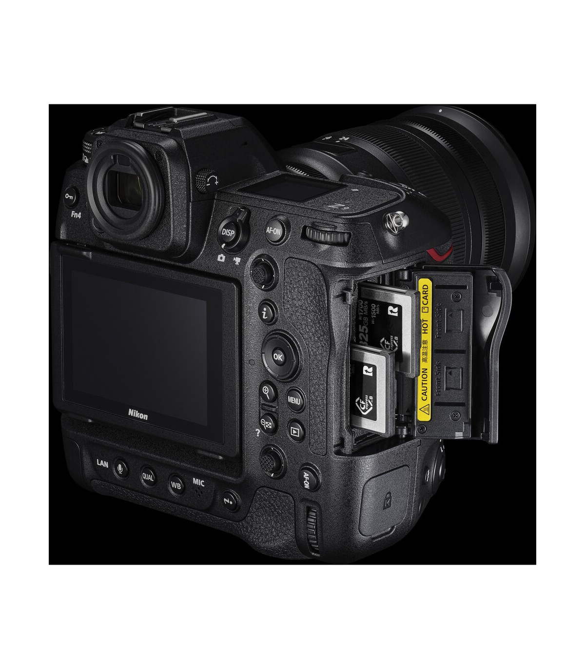 • دو درگاه کارت حافظه CFexpress Type B ذخیره سازی سریع فایلهای سنگین را ممکن میکند. از آنجایی که این دوربین از حسگری با سرعت بالای تبدیل اطلاعات نوری به سیگنالهای دیجیتالی استفاده میکند، به کارت حافظهای با سرعت بالای خواندن و نوشتن برای عکاسی پیایپی یا فیلمبرداری با وضوح بالا نیاز دارد. البته هر دو درگاه از کارتهای XQD پشتیبانی میکنند.