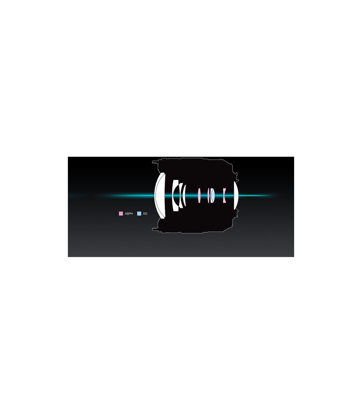 در ساختار اپتیکی این لنز از۱۱ المان تشکیلشده که در ۹ گروه کنار یکدیگر قرارگرفتهاند. از این تعداد۳ المان از نوع آسفریکال و یک عدد از نوع ED میباشد که انحرافات رنگی و دیستورشن را کاهش داده و موجب افزایش وضوح و شارپنس میشوند.